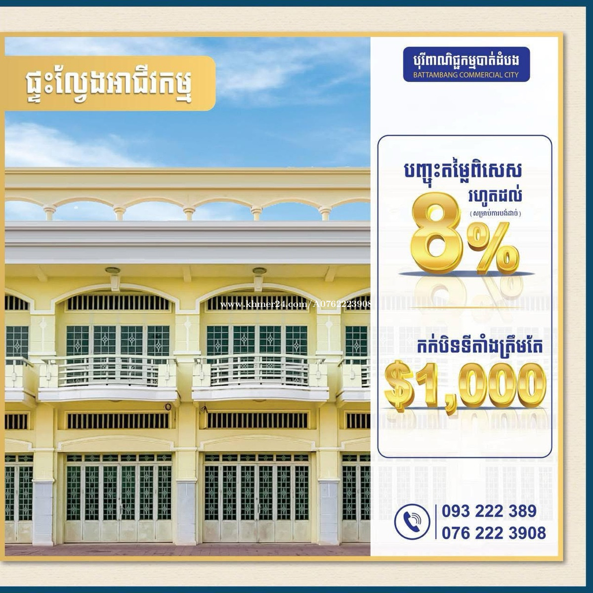 ទទួលបានផ្ទះថ្ងៃនេះ ដោយគ្រាន់តែកក់ប្រាក់1000$ និង ទទួលបានការបញ្ចុះតម្លៃពិសេសរហូតដល់ 8% ជាមួយ បុរី ពាណិជ្ជកម្មបាត់ដំបងចំងាយត្រឹមតែ 1 នាទីពីផ្សាលើ ។ 🌳ស្វែងរក អចលនទ្រព្យ នៅខេត្តបាត់ដំបង 👉 ផ្ទះល្វែង 👉 ដីឡូត៌ 👉 ទីតាំក្នុងក្រុង 👉 ហ៊ុមព័ទ្ធដោយការអភិវឌ្ឍគ្រប់វិស័យ 🌳🍃 📍 សម្រាប់ពត៍មានលំអិត បងៗអាចអញ្ចើញមកកាន់ ការរិយាល័យផ្នែកលក់បានដែរមានទីតាំងស្ថិតនៅក្នុង ធនាគារកាណាឌីយ៉ា ភូមិកម្មករ ឃុំស្វាយប៉ោ ស្រុកបាត់ដំបង ខេត្តបាត់ដំបង រឺទំនាក់ទំនងមក កាន់ទូរស័ព្ទលេខ៖ ☎️093222xxxClick To Call / 0762223xxxClick To Call / 0968573xxxClick To Call ➡️Telegram Channel https://t.me/commercialBattambang ➡️Sales Office Battambang https://maps.app.goo.gl/SP3NhgXNrosLbqM77?g_st=com.google.maps.preview.copy