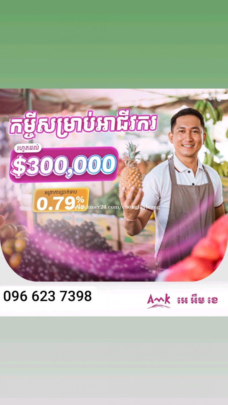 ជំរាបសួរបងៗ អធ្យាស្រ័យបងៗ AMK MFI អាចកម្ចីបានចាប់ពី5ពាន់$ ដល់ 30មុឺន$ ការប្រាក់ 0.67%/1ខែ 7.99%/1ឆ្នាំ Tel:0966237xxxClick To Call / 099476xxxClick To Call