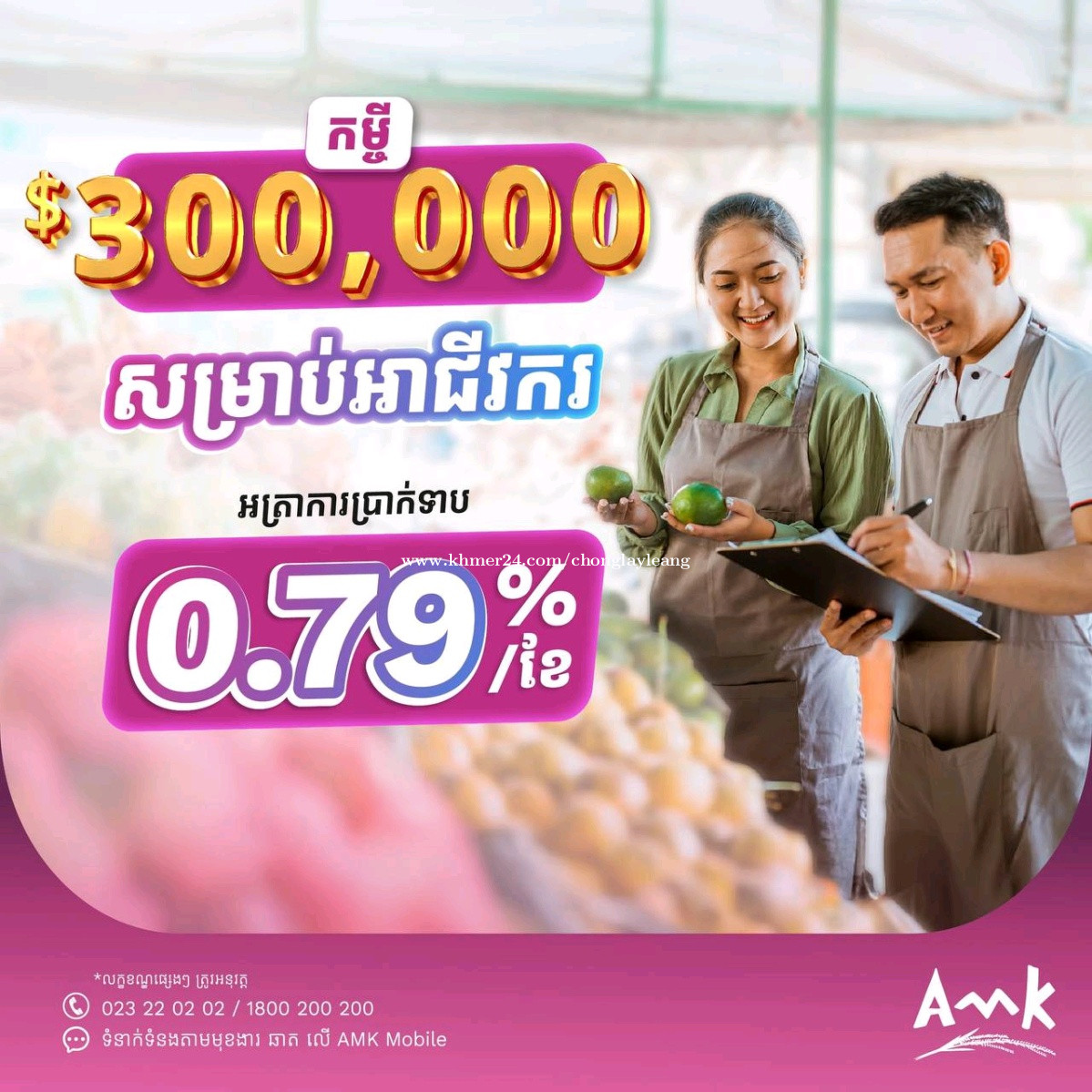 គ្រឹះស្ថានមីក្រូហិរញ្ញវត្ថុ AMK សិក្សាកម្ចី ជាមួយអត្រាការប្រាក់ថយ ពិសេស 8.50% ក្នុងមួយឆ្នាំ! ទំហំកម្ចីរហូតដល់ 70%នៃតម្លៃផ្ទះ 5,000$ ដល់ 300,000$ រយះពេលកម្ចីរហូតដល់20ឆ្នាំ ការសិក្សាអនុម័តលឿន សេវាកម្មល្អប្របកដោយវិជ្ជាជីវៈ ទំនុកចិត្តខ្ពស់ ភាពជឿជាក់ និងរក្សាការសម្ងាត់ជូនអតិថិជនមានផ្តល់ ជូននៅសេវាកម្មដូចជា: 💵កម្ចីផ្តាច់ពីធនាគារផ្សេង និង ពង្រីកអាជីវកម្ម 💵កម្ចីបង់ផ្តាច់ ជាមួយបុរី 💵កម្ចីសាងសង់ផ្ទះ 💵កម្ចីទិញឡាន 💵កម្ចីពង្រីកអាជីវកម្មការប្រាក់ទាប សម្រាប់ពត៍មានលម្អិតបងៗអាចទំនាក់ទំនងតាមរយះ: Tel/Telegram: 0966237xxxClick To Call / 099476xxxClick To Call @Chonglayleang