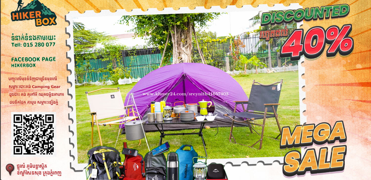 កម្មវិធី Mega Sale Camping gear លក់លាងឃ្លាំង Discount 40%.ប្រញ៉ាប់ឡើង ចំនួនស្តុកមានកំណត់. កុំភ្លេចមកទីតាំងហាងយើងខ្ញុំមើលផ្ទាល់ផលិតផលជាច្រើនមុខទៀត ធានាថាបងប្អូនច្បាស់ជាពេញចិត្ត! Google maps: https://share.google/LkhNBR1dF56NNEdc1 Call::: 010608xxxClick To Call