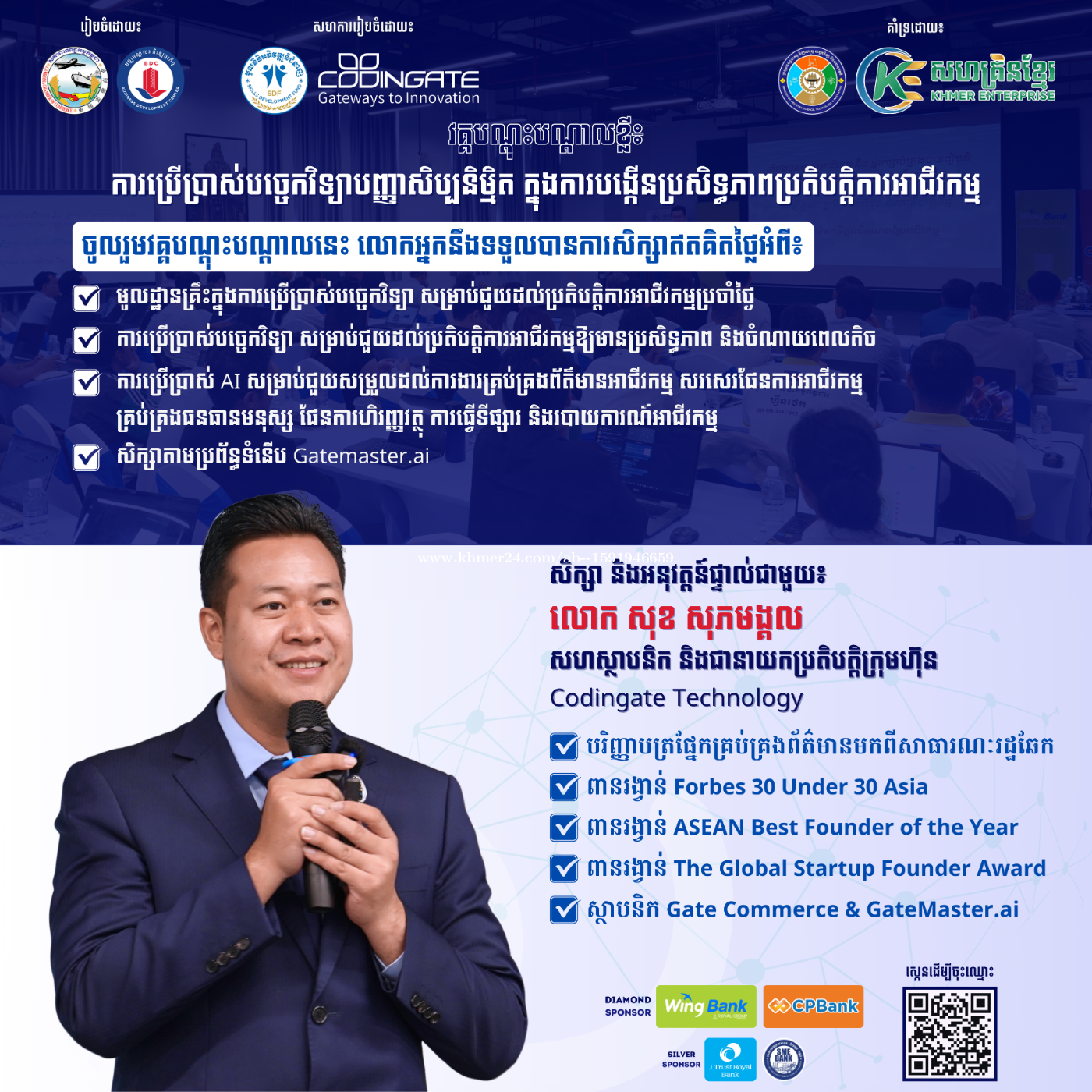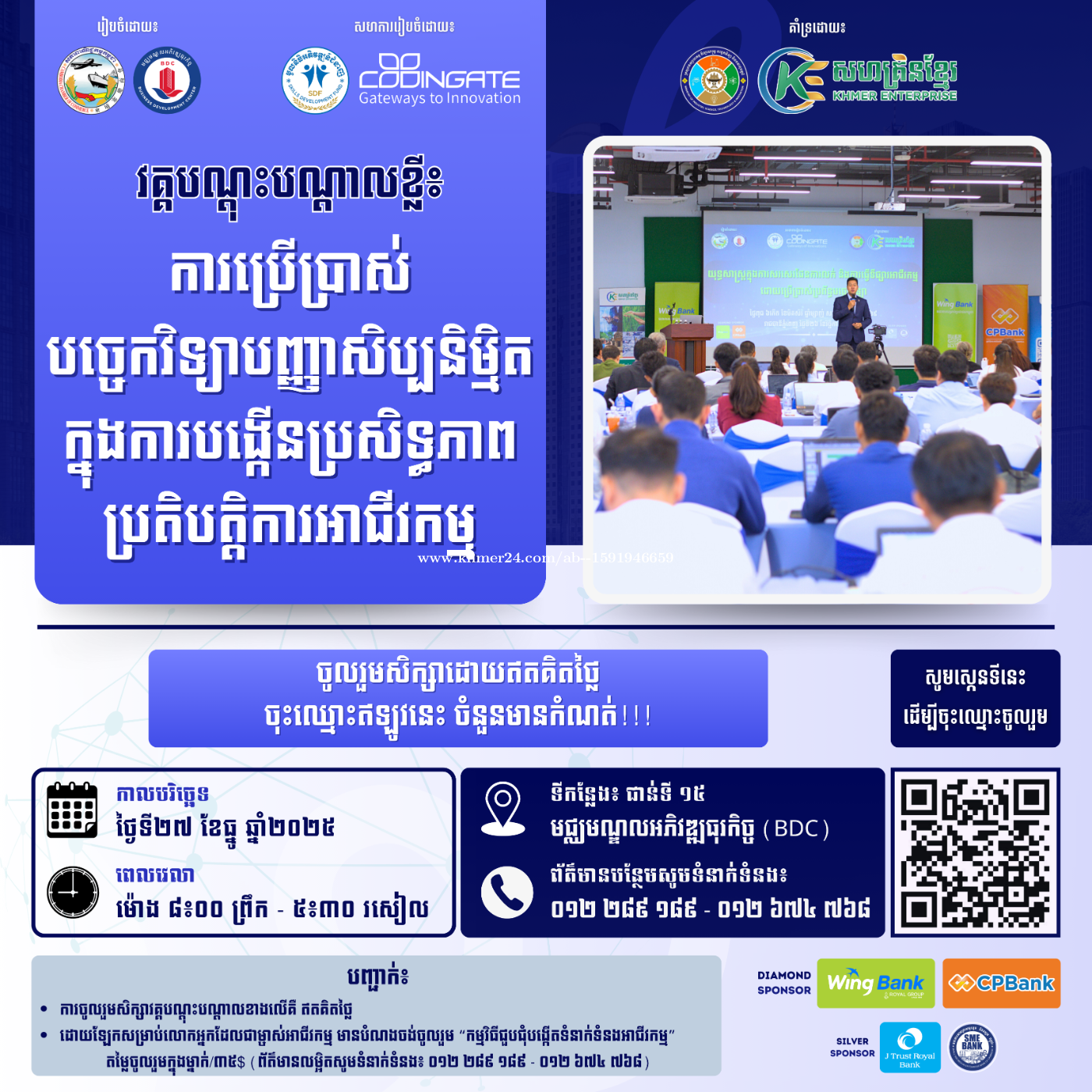 🚨 អភិវឌ្ឍន៍អាជីវកម្មរបស់លោកអ្នកឥឡូវនេះ ជាមួយបច្ចេកវិទ្យាឌីជីថល? ចូលរួមវគ្គបណ្ដុះបណ្ដាលខ្លីស្ដីពី៖ «ការប្រើប្រាស់ប្រព័ន្ធបច្ចេកវិទ្យាបញ្ញាសិប្បនិម្មិតក្នុងការបង្កើនប្រតិបត្តិការអាជីវកម្ម» សម្រាប់ម្ចាស់អាជីវកម្ម ឬម្ចាស់សហគ្រាសធុនតូច និងមធ្យម (SMEs) ដែលចង់ទទួលបានចំណេះដឹងក្នុងការគ្រប់គ្រងប្រតិបត្តិការអាជីវកម្មឱ្យមានប្រសិទ្ធភាព សូមកុំរំលងវគ្គបណ្ដុះបណ្ដាលដ៏ចាំបាច់មួយនេះ! 💼🚀 💡 អ្វីដែលលោកអ្នកនឹងទទួលបានដោយឥតគិតថ្លៃ៖ ✅ មូលដ្ឋានគ្រឹះក្នុងការប្រើប្រាស់បច្ចេកវិទ្យា សម្រាប់ជួយសម្រួលដល់ប្រតិបត្តិការអាជីវកម្មប្រចាំថ្ងៃឱ្យមានប្រសិទ្ធភាព និងចំណាយតិច ✅ ការប្រើប្រាស់បច្ចេកវិទ្យាបញ្ញាសិប្បនិម្មិត សម្រាប់ជួយសម្រួលដល់ការងារគ្រប់គ្រងព័ត៌មានអាជីវកម្ម សរសេរផែនការអាជីវកម្ម គ្រប់គ្រងធនធានមនុស្ស ផែនការហិរញ្ញវត្ថុ ធ្វើទីផ្សារ និងរបាយការណ៍អាជីវកម្ម ✅សិក្សា និងអនុវត្តន៍ផ្ទាល់ជាមួយអ្នកជំនាញក្នុងការប្រើប្រាស់ប្រព័ន្ធបច្ចេកវិទ្យា GateMaster.Ai ដោយឥតគិតថ្លៃ 🎤 វាគ្មិនជំនាញ និងមានបទពិសោធន៍ ៖ សិក្សា និងអនុវត្តន៍ផ្ទាល់ជាមួយ លោក សុខ សុភមង្គល សហស្ថាបនិក និងជានាយកប្រតិបត្តិក្រុមហ៊ុន Codingate Technology 📅 ថ្ងៃសៅរ៍ ទី២៧ ខែធ្នូ ឆ្នាំ២០២៥ 🕗 ម៉ោង ៨:០០ ព្រឹក – ០៥:០០ រសៀល 📍 មជ្ឈមណ្ឌលអភិវឌ្ឍន៍ធុរកិច្ច (BDC) ជាន់ទី១៥ ✍️ ចុះឈ្មោះឥឡូវនេះ៖ https://forms.gle/cknQMH5DpbuknNrNA 🚀 ចូលរួមឥឡូវនេះ! កន្លែងមានកំណត់ 📞 ព័ត៌មានបន្ថែម៖ 012289xxxClick To Call រៀបចំដោយ៖ សភាពាណិជ្ជកម្មកម្ពុជា និងមជ្ឈមណ្ឌលអភិវឌ្ឍធុរកិច្ច (BDC) សហការរៀបចំដោយ៖ មូលនិធិអភិវឌ្ឍន៍ជំនាញ (SDF) និងក្រុមហ៊ុន Codingate Technology គាំទ្រដោយ៖ សហគ្រិនខ្មែរ (KE) #AIកម្ពុជា #អភិវឌ្ឍអាជីវកម្ម #
