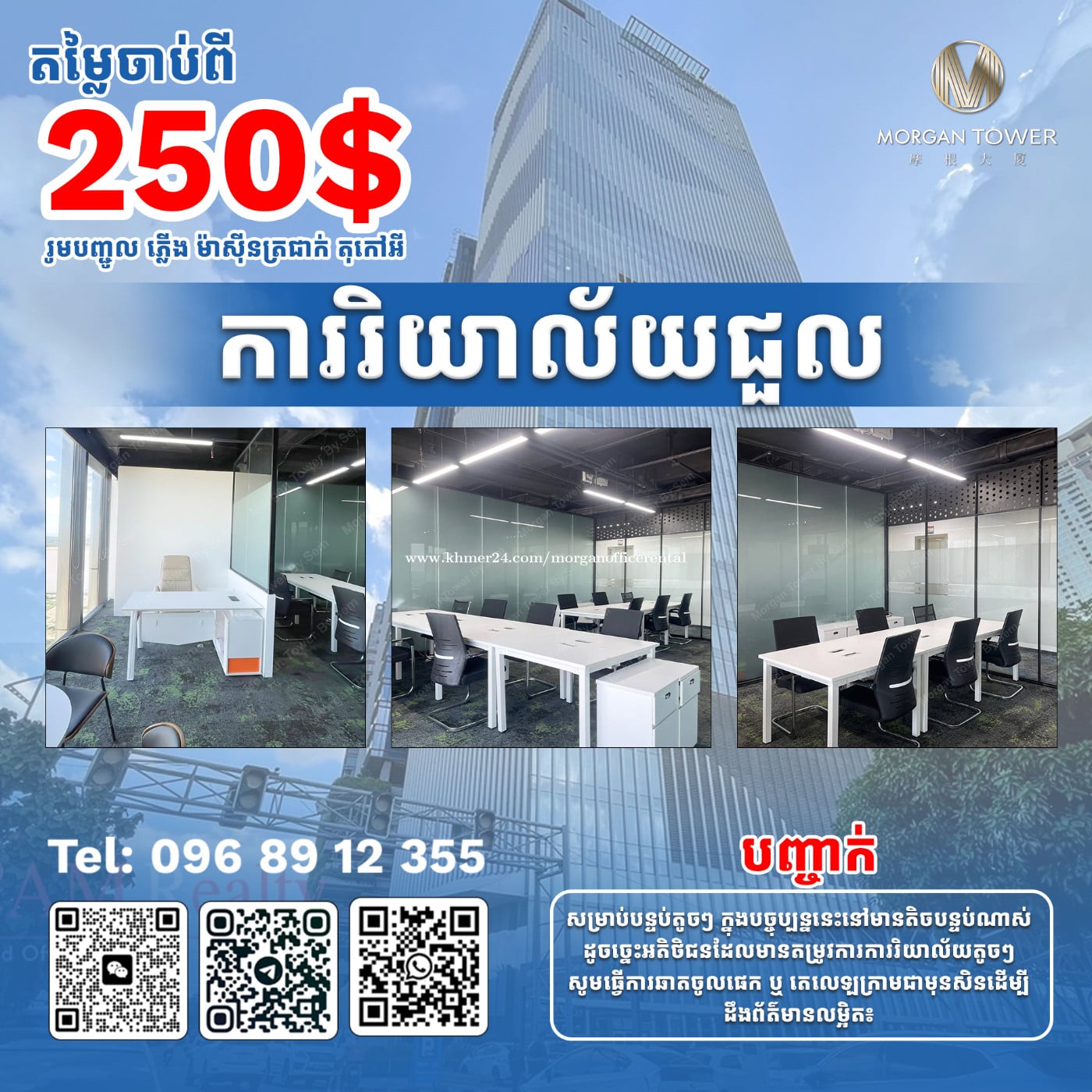 ការរិយាល័យជួលតម្លៃត្រឹមតែ 250$ /ខែឡើងទៅ ផ្តល់ជូនដោយឥតគិតថ្លៃ៖ ✅ តុ និងកៅអី ✅ អ៊ីនធឺណិតល្បឿនលឿន ✅ ថ្លៃម៉ាស៊ីនត្រជាក់ ✅ ថ្លៃអគ្គិសនី ✅ ថ្លៃគ្រប់គ្រងអគារ ✅ ប្រើប្រាស់បន្ទប់ប្រជុំដោយឥតគិតថ្លៃ ✅ បន្ទប់បរិភោគអាហារ ✅ តំបន់សម្រាក និងអង្គុយលំហែកំសាន្ត 🏢 ទំហំការិយាល័យ៖ ចាប់ពី 14sqm ដល់ 54sqm 📍 ជាន់៖ 5AF និង 25F 📞 ទំនាក់ទំនង៖ 0968912xxxClick To Call 💬 Telegram៖(https://t.me/semdigital_and_Marketing)