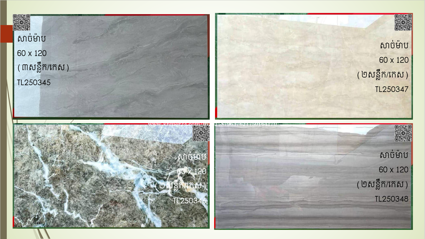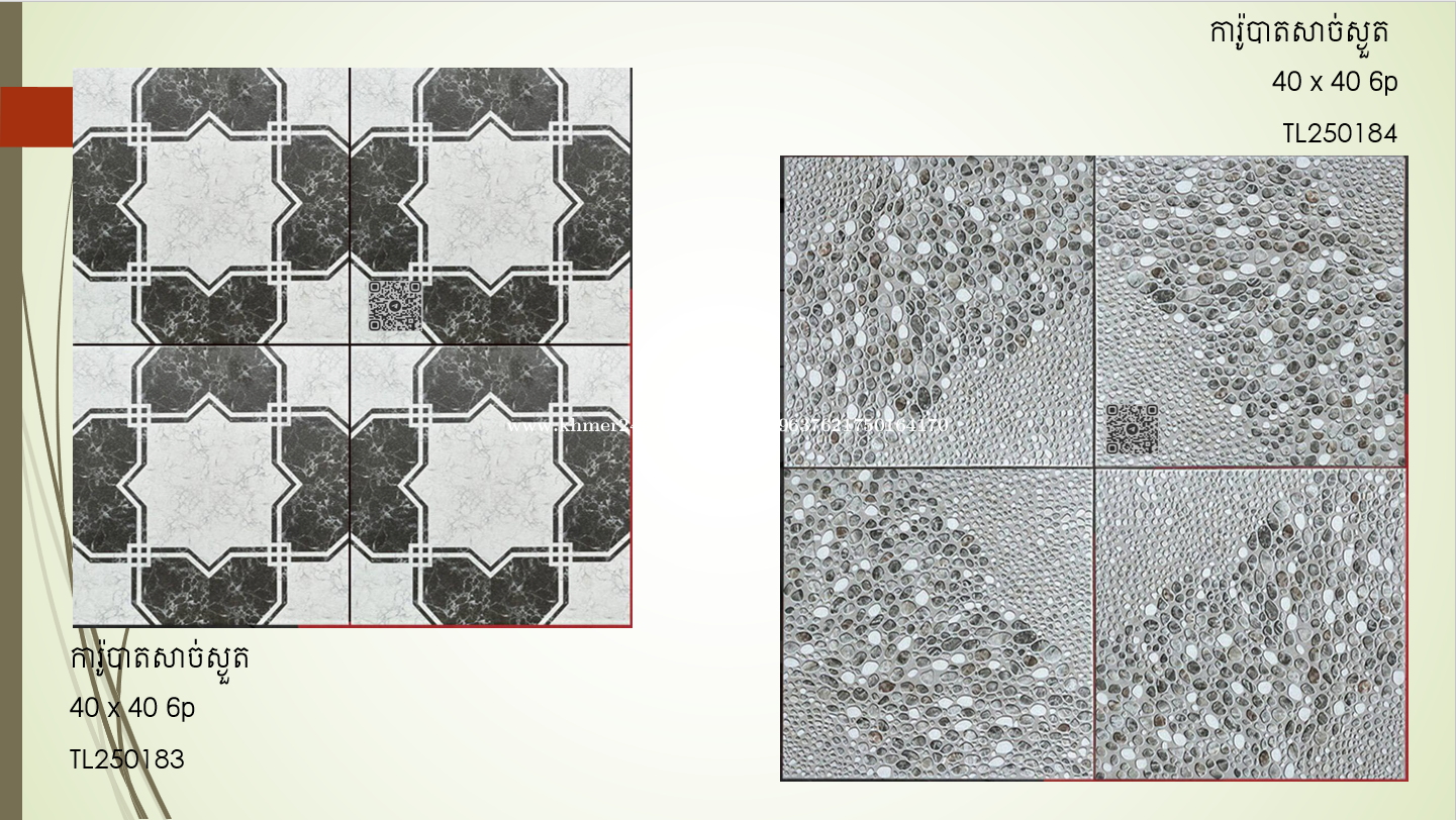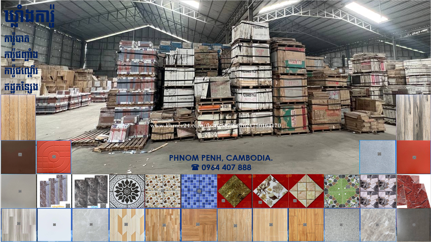 ផ្គត់ផ្គង់សំភារៈការ៉ូ ៖ ការ៉ូសាច់ម៉ាប 60x120 ការ៉ូសាច់ស្ងួត 60x120 ការ៉ូបាតកញ្ចក់លី 80x80 ការ៉ូបាតសាច់ស្ងួត 60x60 / 30x30 ការ៉ូបាតសាច់ម៉ាប 60x60 ការ៉ូបាតសាច់ស្ងួត (សាច់មួយ) 60x60 ការ៉ូកញ្ចក់៤ជាន់ 60x60 ការ៉ូកញ្ចក់ ៣ជាន់ 60x60 ការ៉ូកញ្ចក់ ២ជាន់ 60x60 ការ៉ូចិនសាច់ស្ងួត (សាច់មួយ) 50x50 ការ៉ូកញ្ចក់ ២ជាន់ 50x50 ឥដ្ឋកន្សែងស្ងួតរលោង 40x40 ការ៉ូបាតសាច់ស្ងួត 30x30 ការ៉ូបាតសាច់ស្ងួត 40x40 ការ៉ូបាត ម៉ូដ 30x30 ឥដ្ឋកន្សែងស្ងួតរលោង 30x30 ការ៉ូជញ្ជាំង 30x60 ការ៉ូជ្រី 10x30 ការ៉ូជណ្តើរ 47x120 ការ៉ូជណ្តើរ 47x100 សាកសួរពត៍មានតាមតេលេក្រាមខាងក្រោម.