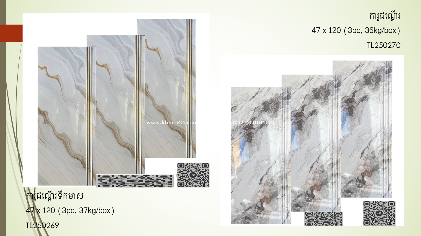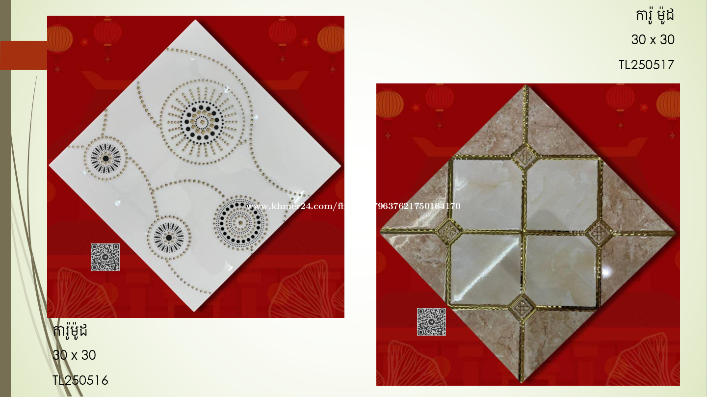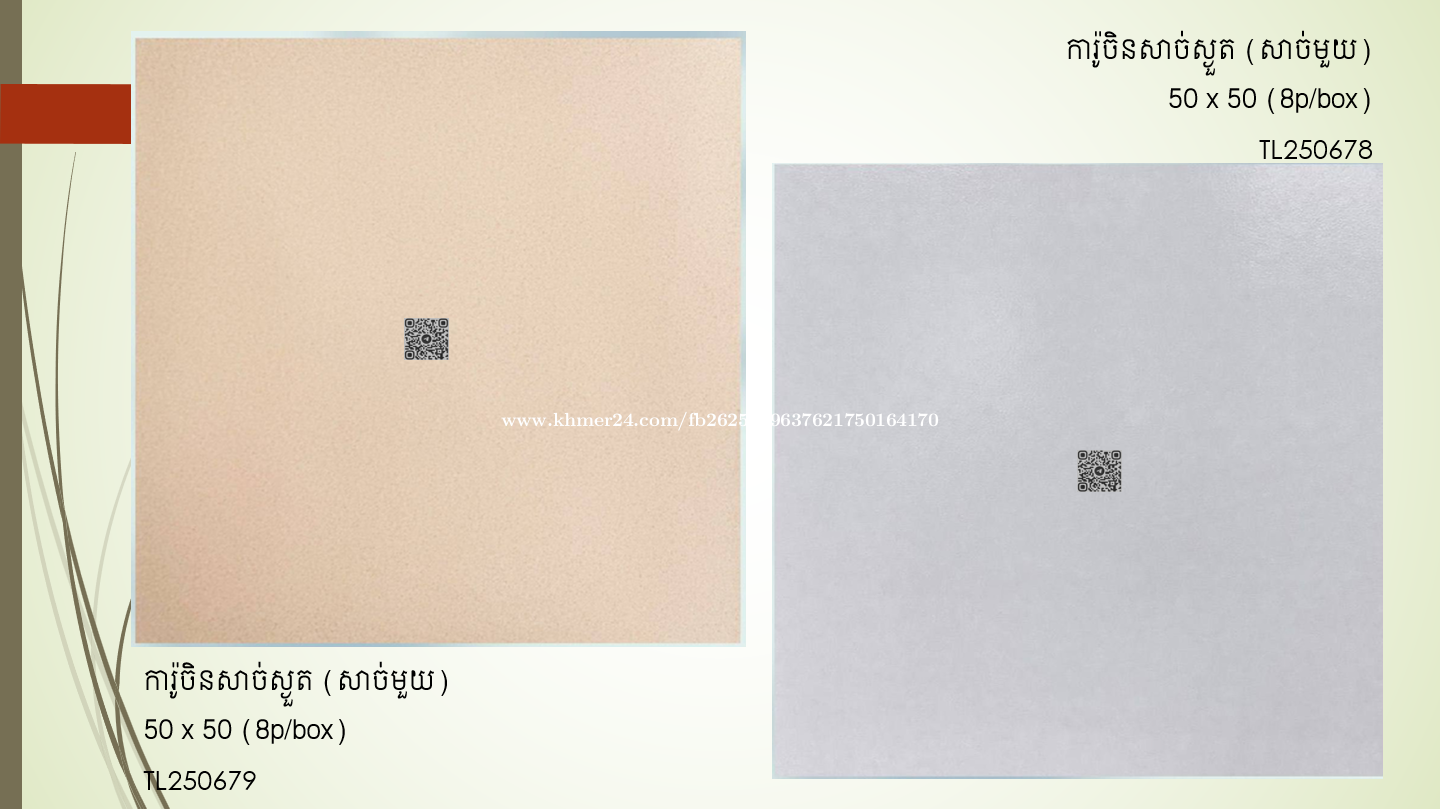 ផ្គត់ផ្គង់សំភារៈការ៉ូ ៖ ការ៉ូសាច់ម៉ាប 60x120 ការ៉ូសាច់ស្ងួត 60x120 ការ៉ូបាតកញ្ចក់លី 80x80 ការ៉ូបាតសាច់ស្ងួត 60x60 / 30x30 ការ៉ូបាតសាច់ម៉ាប 60x60 ការ៉ូបាតសាច់ស្ងួត (សាច់មួយ) 60x60 ការ៉ូកញ្ចក់៤ជាន់ 60x60 ការ៉ូកញ្ចក់ ៣ជាន់ 60x60 ការ៉ូកញ្ចក់ ២ជាន់ 60x60 ការ៉ូចិនសាច់ស្ងួត (សាច់មួយ) 50x50 ការ៉ូកញ្ចក់ ២ជាន់ 50x50 ឥដ្ឋកន្សែងស្ងួតរលោង 40x40 ការ៉ូបាតសាច់ស្ងួត 30x30 ការ៉ូបាតសាច់ស្ងួត 40x40 ការ៉ូបាត ម៉ូដ 30x30 ឥដ្ឋកន្សែងស្ងួតរលោង 30x30 ការ៉ូជញ្ជាំង 30x60 ការ៉ូជ្រី 10x30 ការ៉ូជណ្តើរ 47x120 ការ៉ូជណ្តើរ 47x100 សាកសួរពត៍មានតាមតេលេក្រាមខាងក្រោម.