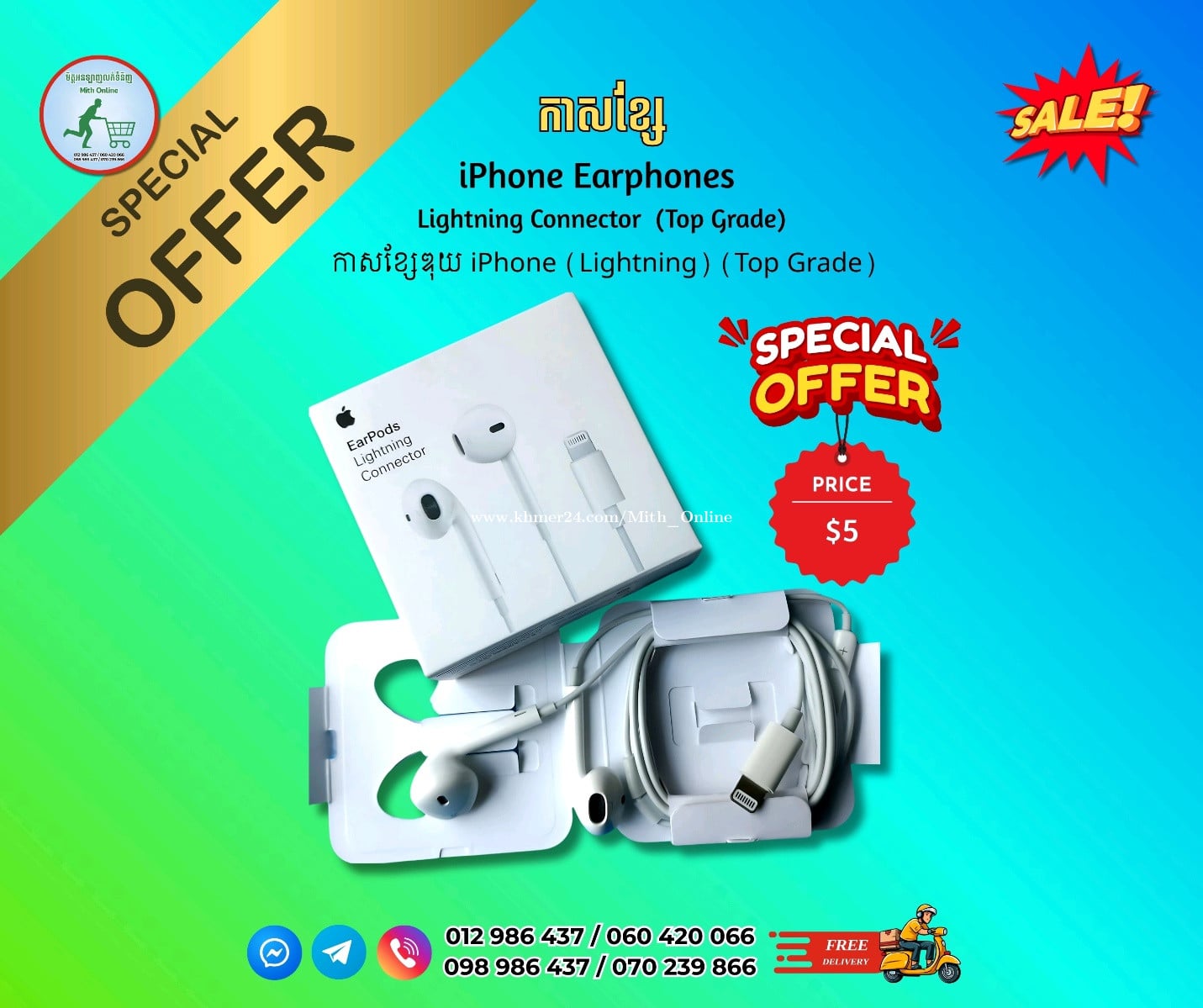 កាសទូរស័ព្ទអាយហ្វូនមានខ្សែ សំលេងឮច្បាស់ល្អ គុណភាពល្អ EarPods with Lightning Connector (Top Grade) 💥💥តម្លៃ $5 ហ្រ្វីដឹកគ្រប់ខេត្ត (Free Delivery) ជាវឬទិញបានពី មិត្តអនឡាញ លក់ទំនិញ ☎️ 012986xxxClick To Call | 060420xxxClick To Call ☎️ 098986xxxClick To Call | 070239xxxClick To Call