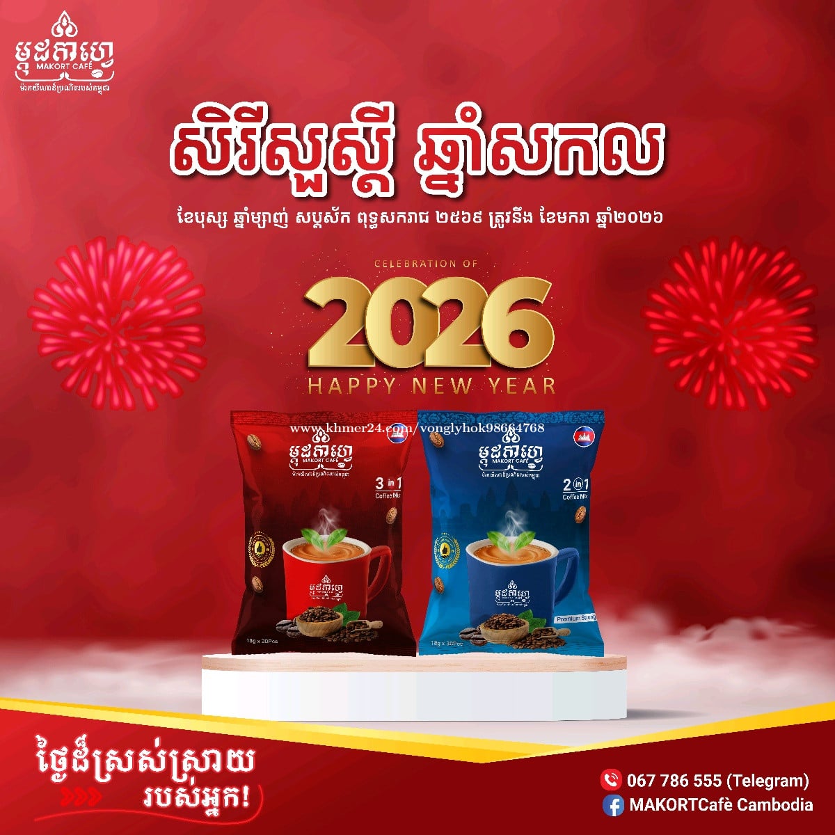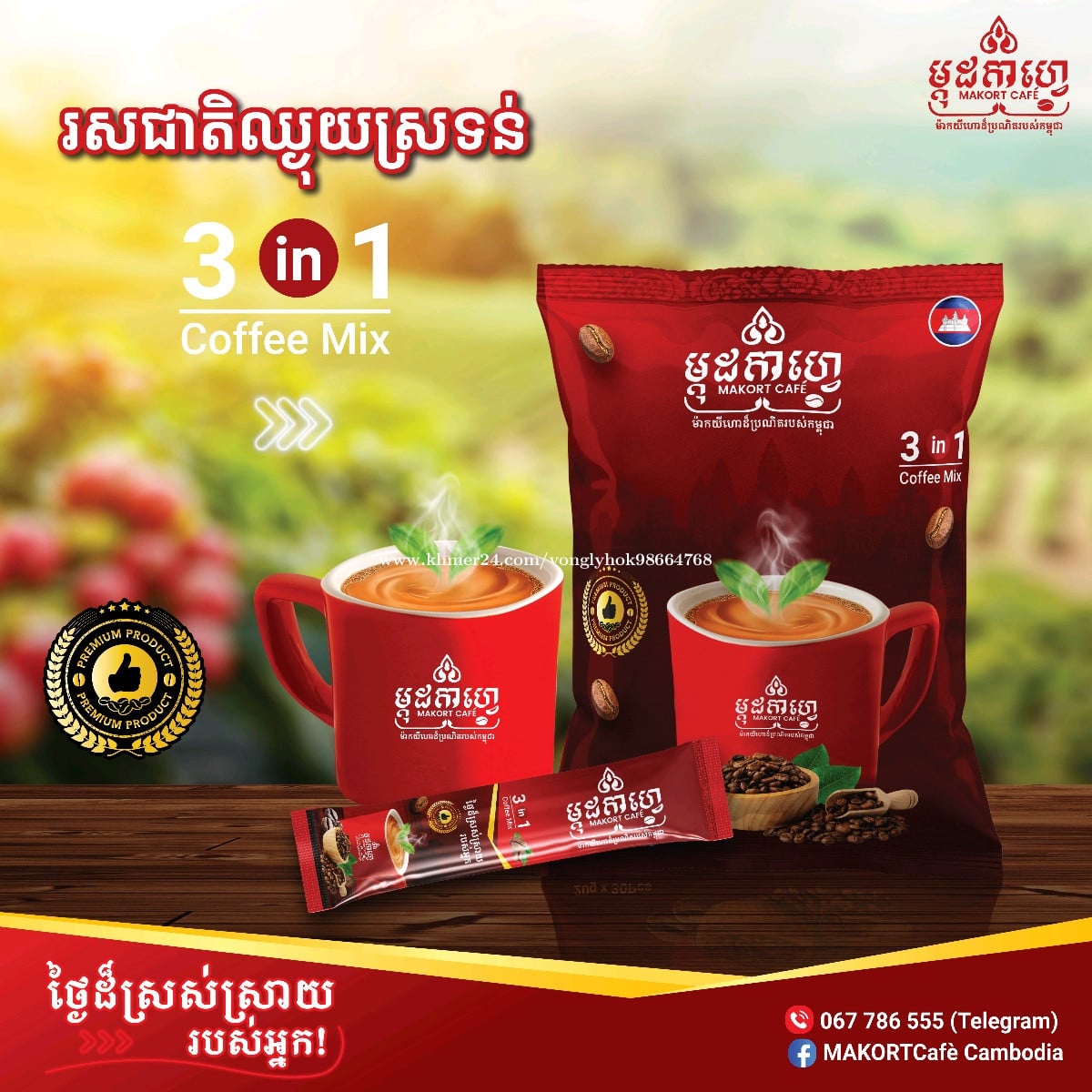 ចាប់ផ្តើមថ្ងៃថ្មីជាមួយ ម្កុដកាហ្វេ🌞☕ (ផលិតផលកូនខ្មែរ១០០%) -------------------------- 📦 កញ្ចប់តូច 🎒 ងាយយកតាមខ្លួន ☕ រសជាតិឆ្ងាញ់ គុណភាពល្អ ⭐តម្លៃសមរម្យ -------------------------- ទំនាក់ទំនងចែកចាយបន្ត៖ ☎️0964141xxxClick To Call ( ផ្នែកលក់ ) ☎️067786xxxClick To Call ☎️0973377xxxClick To Call #morning #coffee #MAKORTCafé #cambodiaproduct #ផលិតផលកូនខ្មែរ