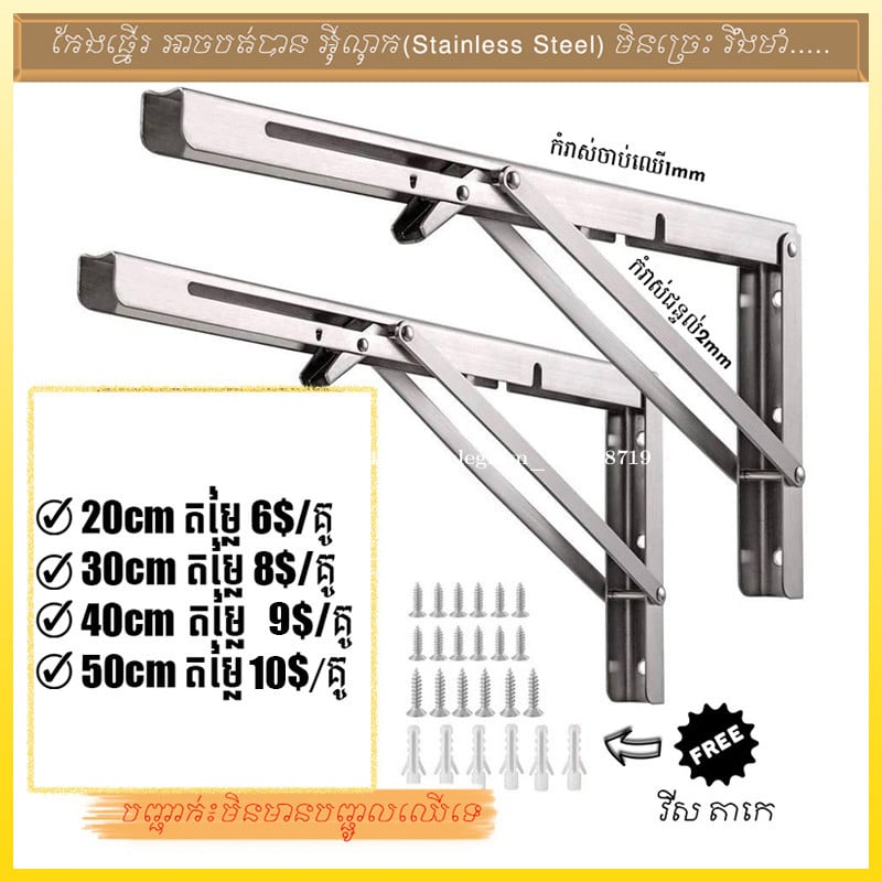 កែងធ្នើរទំនើប អាចបត់បាន ប្រភេទដែក Stainless Stell(អុីណុក) រឹងមាំ មិនច្រេះ ទ្របានធ្ងន់ មានប្រវែងចាប់ពី▶ ✅200mm ✅300mm ✅400mm ✅500mm ☎ទំនាក់ទំនង 0966999xxxClick To Call/077898xxxClick To Call 🛵ដឹកជញ្ជូនគ្រប់ទីកន្លែង