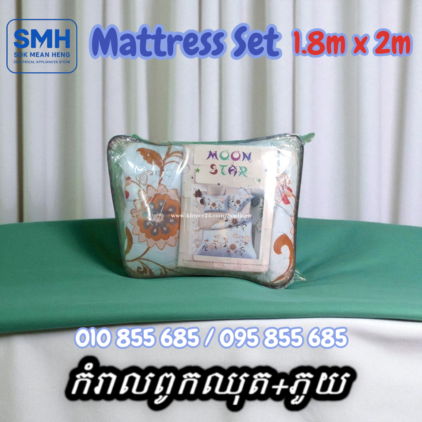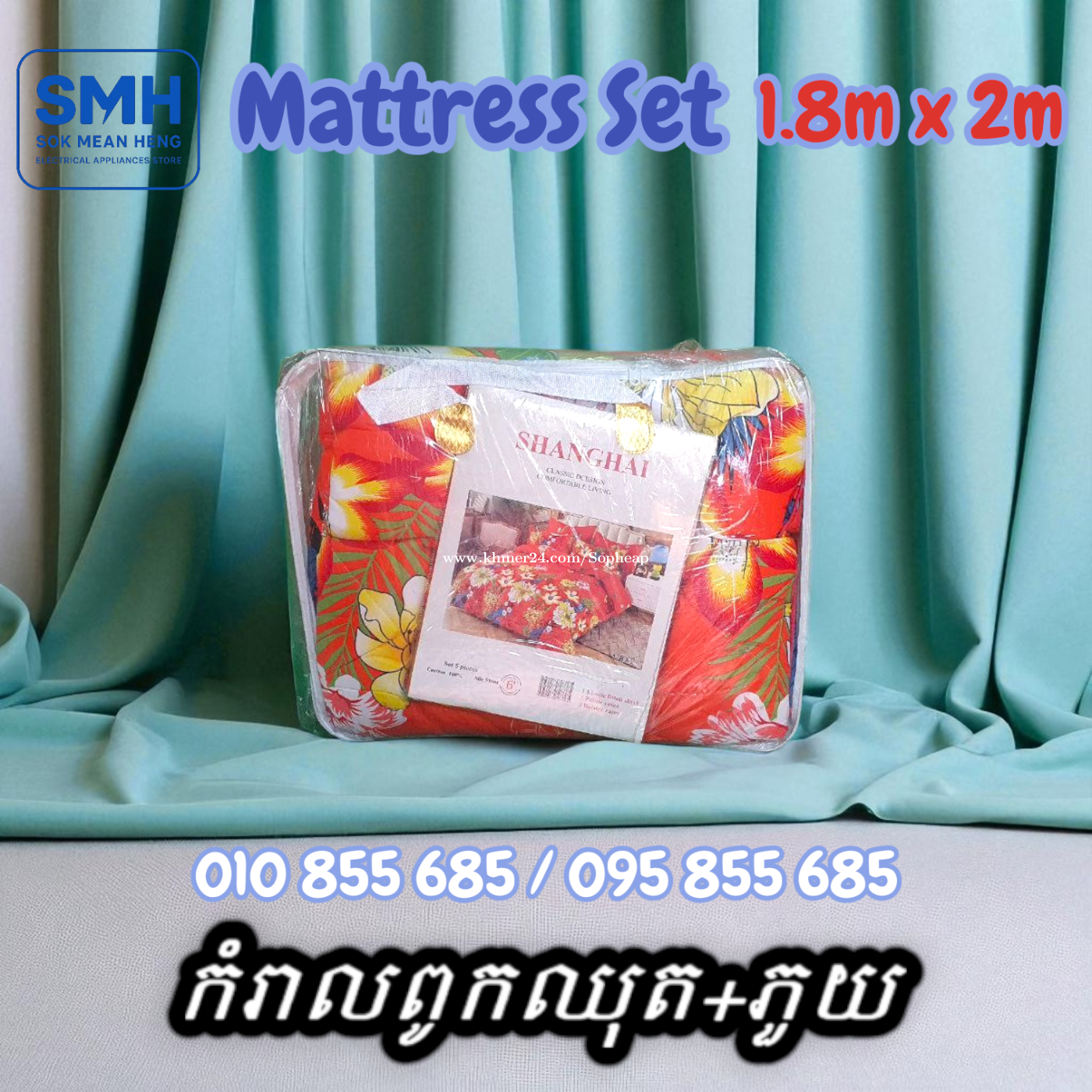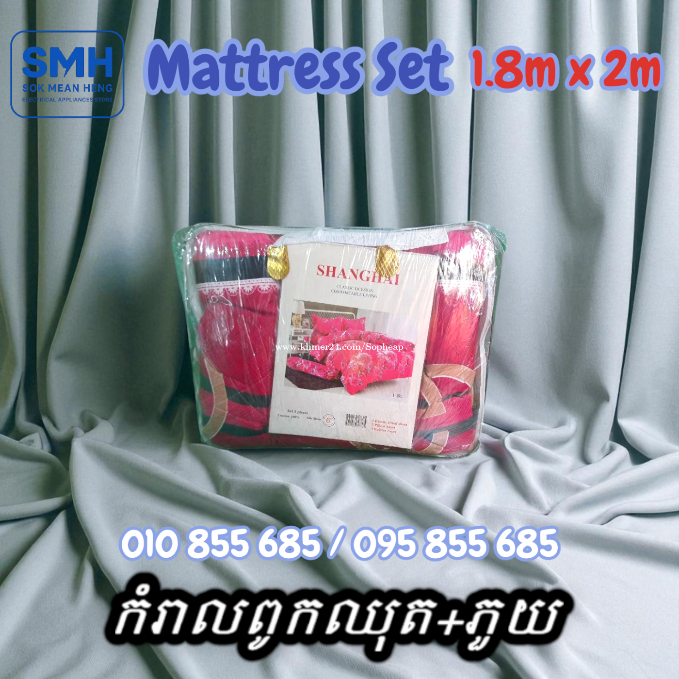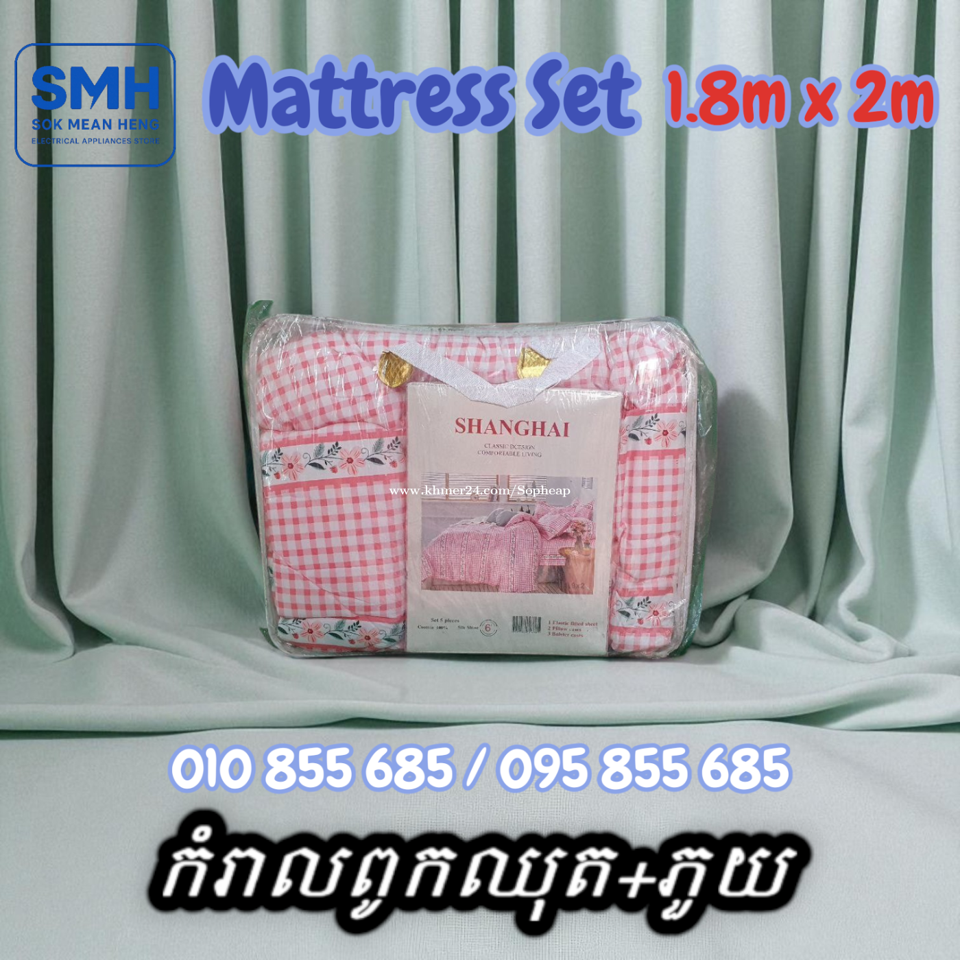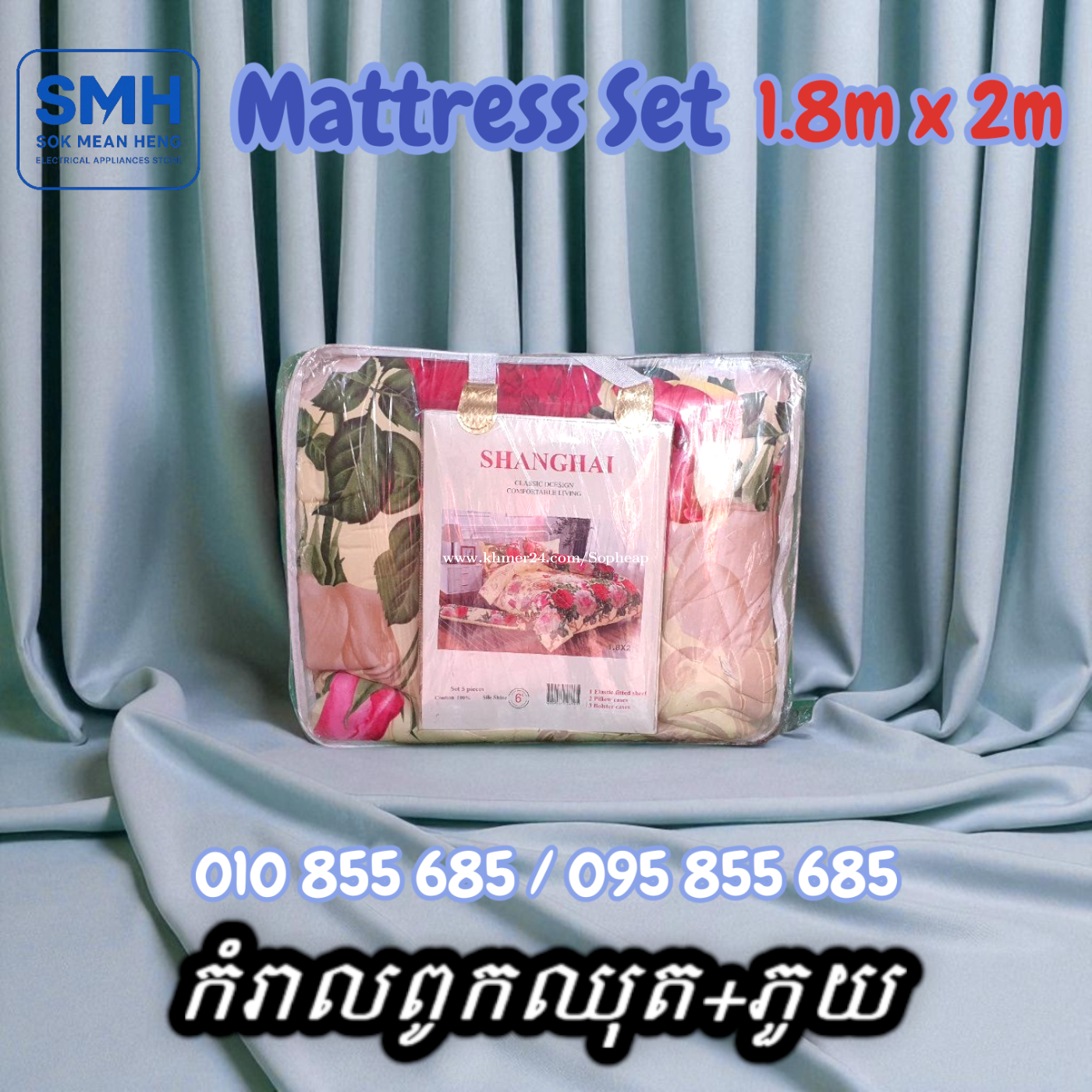 កំរាលពូកឈុត+ភួយ / Mattress Set+Blanket _ 1.8m x 2m _ Clearance Sale _ New _Demo . - ទំហំ / Size: 1.8m x 2m - បញ្ចុះតម្លៃពិសេស! ជាផលិតផលតាំងបង្ហាញនៅក្នុងហាង! - Special discount! This is a product on display in the store! - កំរាលពូកឈុត (ស្រោមពូក = 1 / ស្រោមខ្នើយកើយ = 2 / ស្រោមខ្នើយឱប = 2 / ភួយ = 1) - Mattress Set (Mattress Cover = 1 / Pillow case = 2 / Body Pillow case = 2 / Blanket = 1) * Note: កំរាលពូកឈុតខ្លះមានស្រោមខ្នើយ ខ្លះទៀតអត់មាន. និងមានខ្លះប្រលាក់បន្តិចបន្ទួច. * Note: Some Mattress Set has Pillow Case, some are not. And some are a little dirty. . * តំលៃ / Price: 22.9$ . SMH / សុខ មាន ហេង / Sok Mean Heng ហាងលក់គ្រឿងប្រើប្រាស់អគ្គិសនី / Electrical Appliances Store . ✅ ហាងផ្លូវការដែលមានការទទួលស្គាល់ត្រឹមត្រូវដោយ Khmer24 / Verified Business Account by Khmer24 💯 ទទួលបានទំនុកចិត្តខ្ពស់ពីអតិថិជនជាច្រើន / Trusted by Real Customers. 📍 មានទីតាំងច្បាស់លាស់ និងពិតប្រាកដនៅភ្នំពេញ / We have a clear and real/verified location in Phnom Penh. . Phone / Telegram (សេវាកម្មរហ័ស / Fast Service): Smart: 010855xxxClick To Call / https://t.me/Annsopheap Cellcard: 095855xxxClick To Call / http://t.me/Annsopheap095 . អាស័យដ្ឋាន / Address: No. 392, MaoTseToung Blvd. (St. 245), Phnom Penh. (Near P Jolie Beauty Center) . ផែនទី / Maps: https://www.google.com/maps?q=11.55595844757693,104.90165490657091&15 . #កំរាលពូក #ស្រោមពូក #ស្រោមខ្នើយ #ភួយ #ខ្មែរ #ថៃ #ចិន #គ្រឿងអគ្គីសនី #គ្រឿងប្រើប្រាស់អគ្គិសនី #MattressSet #MattressCover #PillowCase #Blanket #SMH #Khmer #Thailand #China #Appliances #ApplianceStore #HomeAppaliance #ElectricAppliances #ElectricalAppliances #Promotion #Discount #Save #Free #New