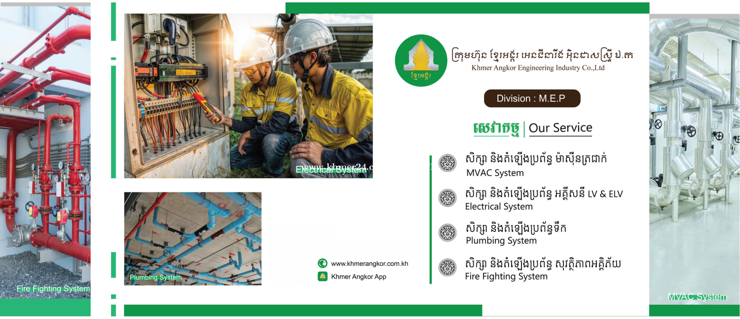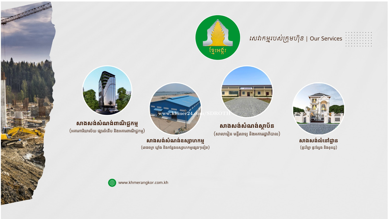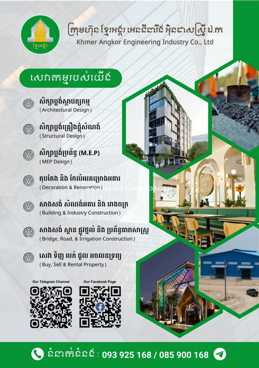 👷♂️ក្រុមហ៊ុនខ្មែរអង្គរ ផ្ដល់ជូននូវសេវាកម្ម សាងសង់ និងទិញ-លក់-ជួលអចលទ្រព្យដែលមានបទពិសោធន៍ជាច្រើនឆ្នាំ ប្រកបដោយគុណភាព | ប្រណិតភាព | សុវត្ថិភាព | ទំនុកចិត្តខ្ពស់ ព្រមទាំងតម្លៃសមរម្យជូនដល់អតិថិជន។ 📌 សិក្សា និងគូរប្លង់ស្ថាបត្យកម្ម 📌 សាងសង់លំនៅឋាន អគារពាណិជ្ជកម្ម សំណង់ឧស្សាហកម្ម 📌 រៀបចំប្រព័ន្ធទឹក ភ្លើង ម៉ាស៊ីនត្រជាក់ និងប្រព័ន្ធសុវត្ថិភាព 📌 រៀបចំដេគ័រ និងកែលម្អគម្រោងអាគារ 📌 ដោះស្រាយបញ្ហាលេចជ្រាបក្នុងអាគារ 📌 សាងសង់ស្ពាន ផ្លូវថ្នល់ និងប្រព័ន្ធធារាសាស្ត្រ 📌 សេវាកម្មទិញ លក់ ជួលអចលទ្រព្យគ្រប់ប្រភេទ 🤝 សូមទំនាក់ទំនងសំរាប់ពត៌មានបន្ថែម ☎️ 085368xxxClick To Call / 061811xxxClick To Call 📩 t.me/Daroth_KAEI 🌐 www.khmerangkor.com.kh