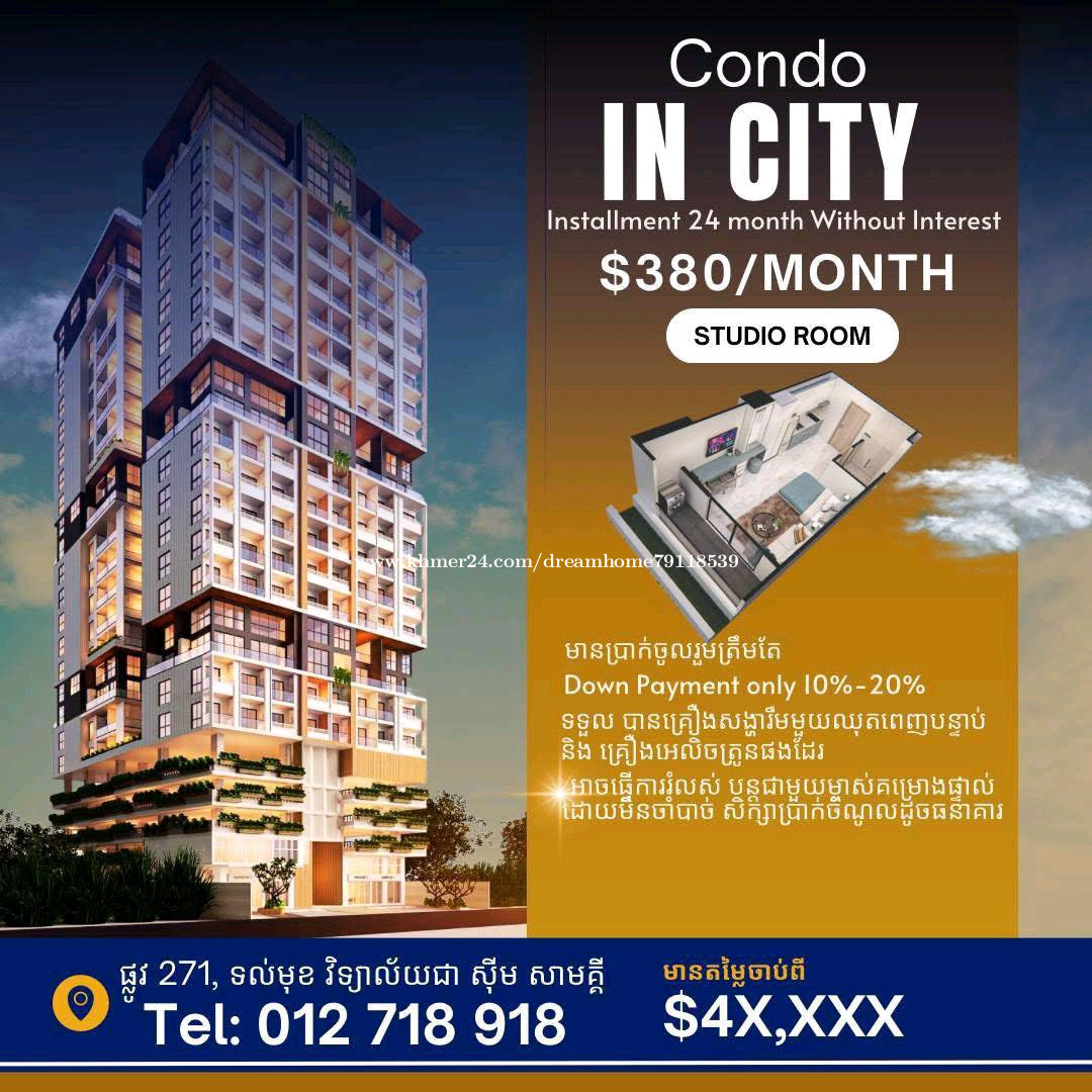 🌃ខុនដូកណ្តាលក្រុង ស្រួលរស់នៅ ចូលនៅបានភ្លាម ៗ 🔹បង់រំលស់ប្រចាំខែ ចាប់ពី 380$ ក្នុងមួយខែ 🔹រំលស់គ្មានការប្រាក់ 24 ខែ គ្មានការប្រាក់ 🔹 មានត្រឹមតែ 10%-20% បងប្អូននឹង ទទួល បាន គ្រឿងសង្ហារឹម មួយឈុតពេញ និងគ្រឿងអេលិចត្រូនិចផងដែរ 🔹បន្ទាប់ ពី 2 ឆ្នាំ ហើយ បងប្អូន អាចបង់រំលស់បន្តជាមួយម្ចាស់គម្រោងផ្ទាល់បានផង ដោយមិនចាំបាច់សិក្សាប្រាក់ចំណូល សម្រាប់ព័ត៌មានបន្ថែម ☎️012718xxxClick To Call Cellcard ☎️069718xxxClick To Call Smart ☎️ 0972666xxxClick To Call Met phone (Telegram Whatsapp and WeChat) 💬 https://t.me/VateyChea_propertyconsultant