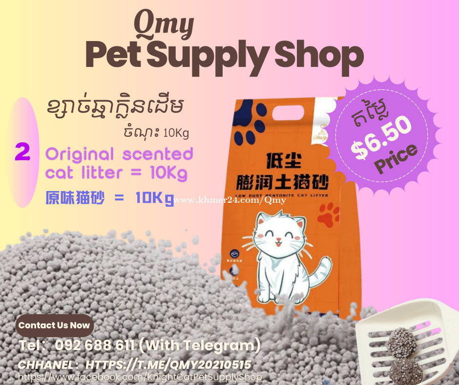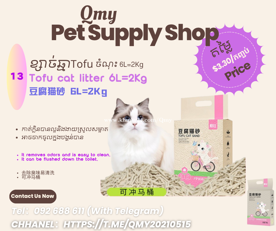 ខ្សាច់ឆ្មាមានគុណភាពល្អតម្លៃធូ 1កញ្ជប់10Kg តម្លៃត្រឹម6.5$~7.0$ 【1】ខ្សាច់ឆ្មាក្លិនប៉ោម 1កញ្ជប់10Kg តម្លៃត្រឹម7.00$ 【2】ខ្សាច់ឆ្មាក្លិនដើម 1កញ្ជប់10Kg តម្លៃត្រឹម6.50$ 【3】ខ្សាច់ឆ្មាTofu 1កញ្ជប់2Kg តម្លៃត្រឹម3.30$ Telegram https://t.me/Qmy092688611 Chanel https://t.me/Qmy20210515
