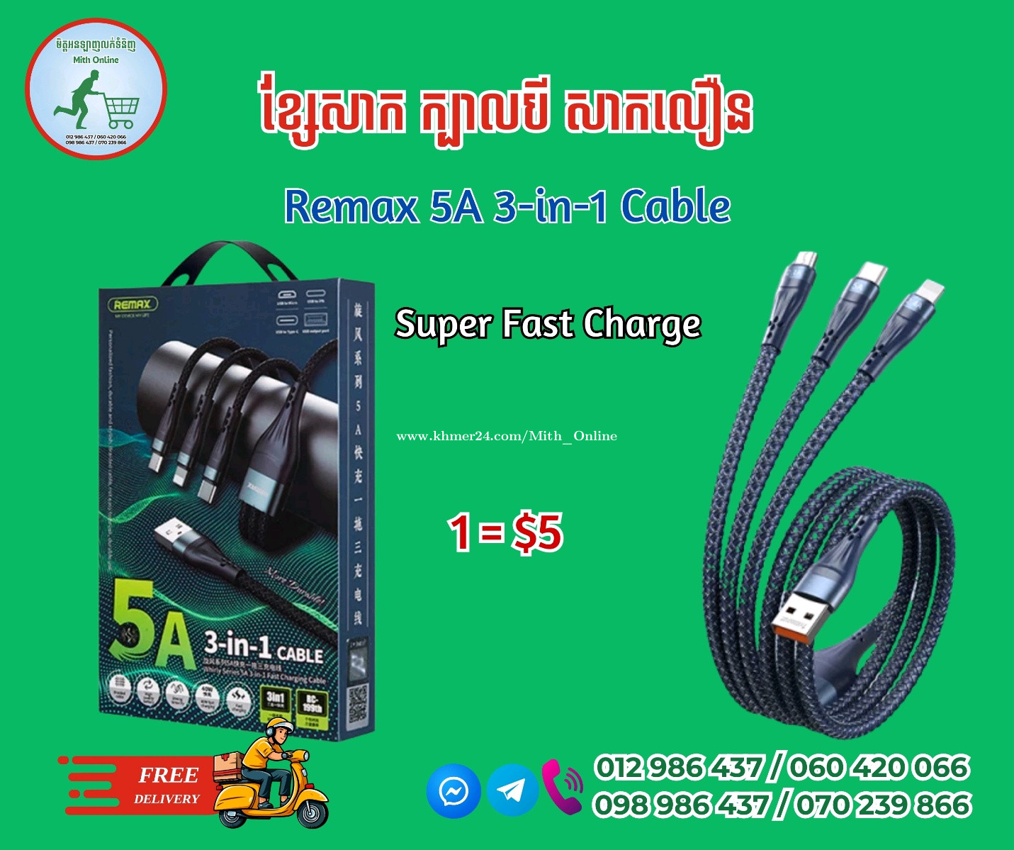 3in1 ខ្សែសាកទូរស័ព្ទ កំលាំងរួម 5A មុខងារសាកបានលឿន ប្រើបានគ្រប់ប្រភេទ ទូរស័ព្ទ (Type-C, Micro, Lightning) ម៉ាក Remax ខ្សែស្វិតមាំល្អ 💥តម្លៃ $5 (ហ្វ្រ៊ីដឹក free delivery) ☎️098986xxxClick To Call ☎️ 012986xxxClick To Call ☎️070239xxxClick To Call ☎️ 060420xxxClick To Call