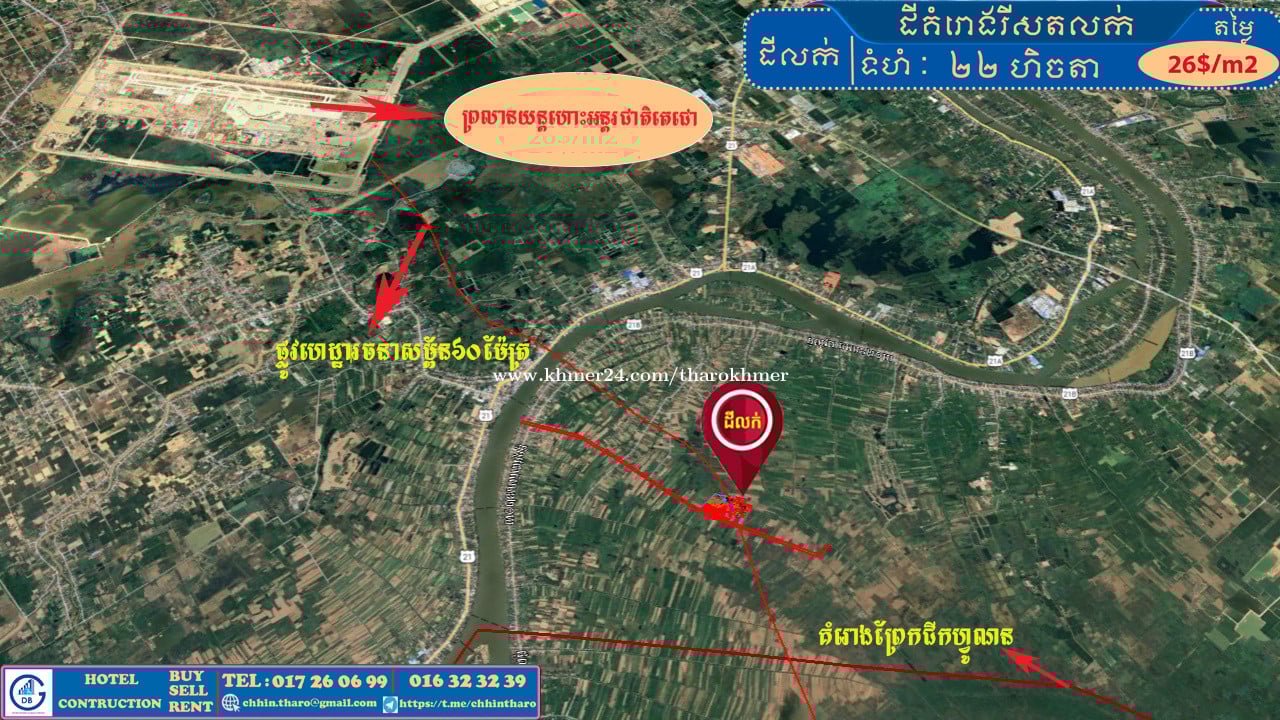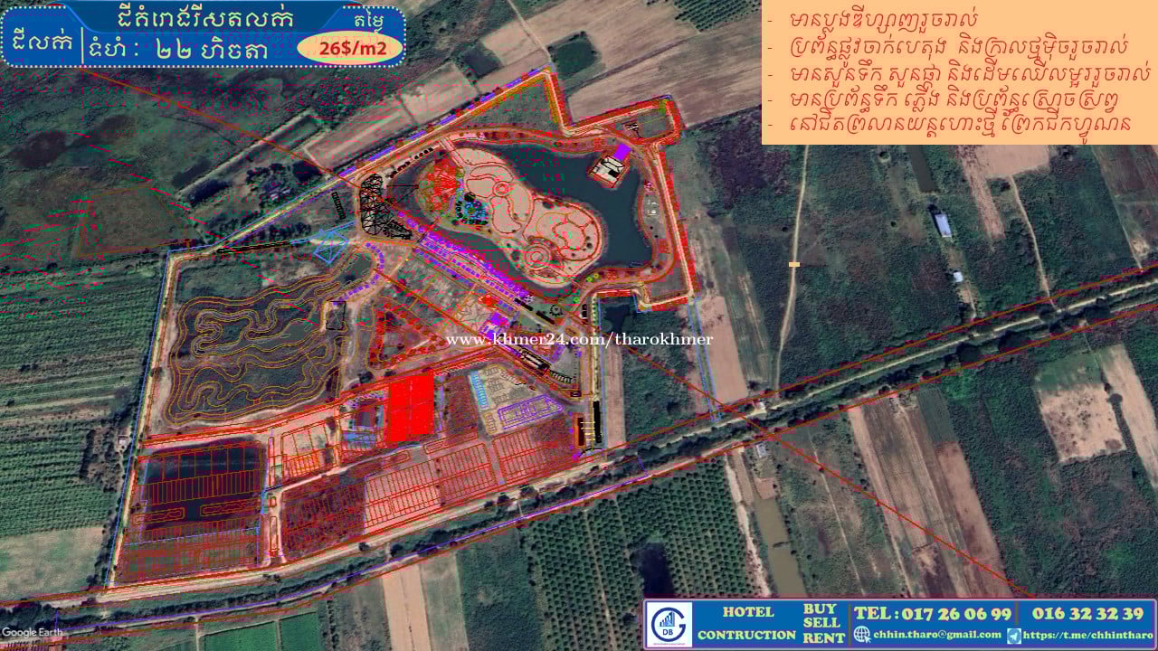 គម្រោងរីសតលក់ ឃុំស្វាយប្រទាល ភូមិពោធិតាប៉ាង ស្រុកស្អាង ខេត្តកណ្ដាល 👉. ទំហំ: 22 ហិចតា 👉. ប្លង់រឹង (ស្រប់ច្បាប់ ) 👍. ទីតាំងល្អ - បរិយាកាសបរិសុទ្ធ - ទំហំដីធំអាចធ្វេីជារីសត និងបុរី (មានប្លង់ឌីហ្សាញរួចរាល់) - មានប្រព័ន្ធទឹក ភ្លេីង និងប្រព័ន្ធស្រោច ស្រព្វស្មៅ ផ្កា និងដេីមឈេី - ផ្ទៃដីពាក់កណ្ដាលបានចាក់បំពេញ និង មានសួនទឹក សួនផ្កា សួនស្មៅ - មានដាំដេីមឈេីលម្អររួចរាល់ 👉. នៅក្បែរព្រលានយន្តហោះថ្មី និងព្រែក ជីកហ្វូណន និងគំរោងផ្លូវ60m 👍. តម្លៃ: 26$/m2 💵. បញ្ជាក់៖ តម្លៃលក់បន្ទាន់ 🌏. ទីតាំងដី: https://maps.app.goo.gl/6v8YqToNsraFKkCYA?g_st=it 📍. ទ្រង់ទ្រាយដី: https://share.fams.app/v3/2024-09-12/8281a2f4-e9af-41c4-8f21-4d4a48a52a7f 👉. សម្រាប់ពត័មានលម្អិត 017260xxxClick To Call , 016323xxxClick To Call 👉. តេលេក្រាមឆាត: https://t.me/chhintharo