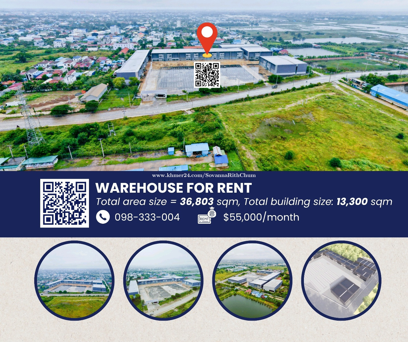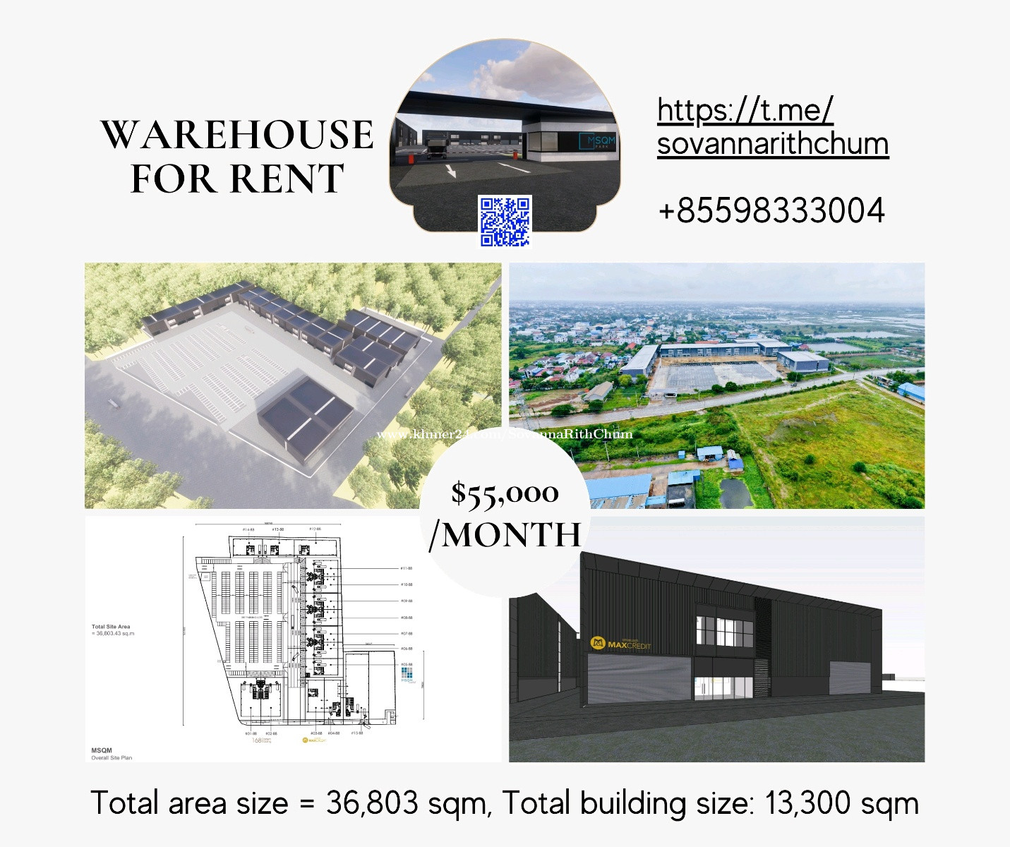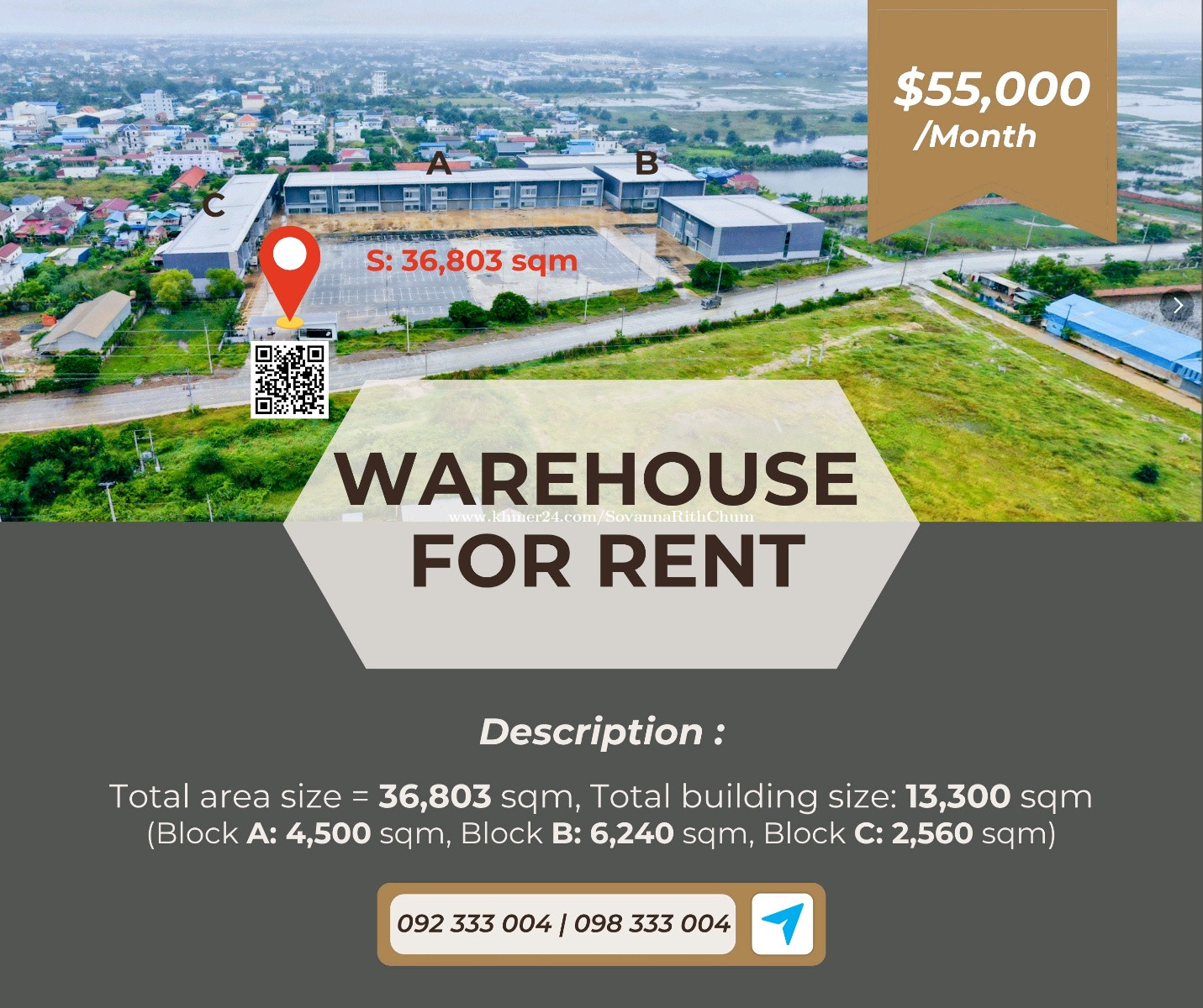 🏢 **Warehouse for Rent!** 🏢 📍 **Address:** Sangkat PrekHo, Krong Ta Khmau, Kandal Province, near Techo International Airport (KTI) អាកាសយានដ្ឋានអន្តរជាតិតេជោ ✨ Total Area: 36,803 sqm ✨ Total Building Size: 13,300 sqm - Block A: 4,500 sqm - Block B: 6,240 sqm - Block C: 2,560 sqm 💰 Rent: $55,000/month For inquiries, send us a message or contact: 📞 092333xxxClick To Call / 098333xxxClick To Call 🔑 Don't miss out on this fantastic opportunity for your business! #WarehouseForRent #CommercialProperty #BusinessOpportunity #RealEstate