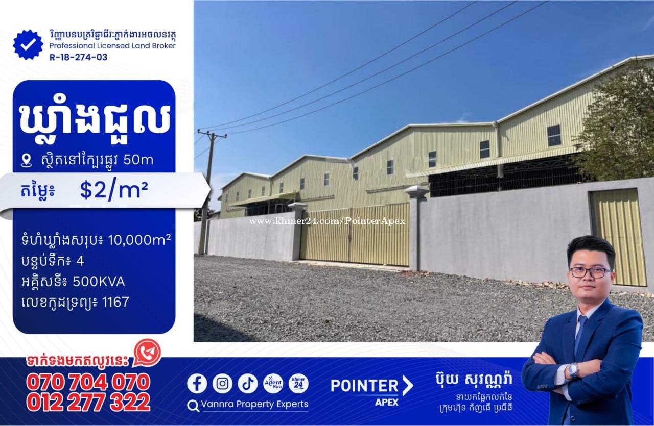 ឃ្លាំងជួលនៅជិតផ្លូវក្រវ៉ាត់ក្រុងទី2 ឬផ្លូវ50m សម្រាប់ជួល: $2/m² ទំហំឃ្លាំង: 10,000m² បន្ទប់ទឹក: 4 អគ្គិសនី:500KVA អាចជួលចាប់ពីទំហំ2,500m² 🔐លេខកូដអចលនវត្ថុ៖ 1167 ស្ថិតនៅក្បែរផ្លូវក្រវ៉ាត់ក្រុងទី 2 សង្កាត់ព្រៃស ខណ្ឌដង្កោ ភ្នំពេញ ——————————— ទាក់ទងមកឥលូវនេះ៖ Call: 070704xxxClick To Call / 012277xxxClick To Call Telegram: https://t.me/vannraaa 微信号: vannra-experts - Channel: https://t.me/vannrapropertyexperts - Tiktok: https://www.tiktok.com/@vannra_property_experts - Facebook: https://www.facebook.com/vannra.phnompenh.property/