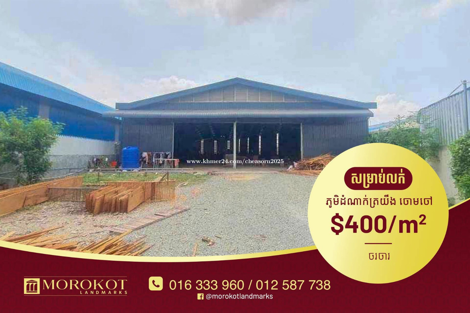 🏠 ឃ្លាំងនិងដីលក់ #បន្ទាន់ខ្លាំង #NR3 ចោមចៅ 👉 តម្លៃ $400/m² (ចរចា) 👉 ចំណូលពីជួលស្រាប់ $1,850/ខែ ⛳️ ទីតាំងល្អ នៅភូមិដំណាក់ត្រយឹង សង្កាត់ចោមចៅ ខណ្ឌពោធិ៍សែនជ័យ ផ្លូវជាតិលេខ3, ក្បែរផ្សារសន្តិភាព2 👉 ទំហំដី 15m x 100m (2019m²) 👉 ទំហំឃ្លាំង 23m x 66m (1,400m²) 👉 ឃ្លាំងទើបសង់ថ្មី ភ្ជាប់បណ្តាញទឹកស្អាតរួចស្រេច និងភ្លើងកំលាំង3ហ្វា ងាយស្រួលសម្រាប់បើកសិប្បកម្មខ្នាតតូច ឬឃ្លាំងស្តុកទំនិញ ។ល។ ☎️ ព័ត៌មានបន្ថែម : 012587xxxClick To Call / 016333xxxClick To Call (Telegram) #Morokot_Landmarks #houseforsale #houseforrent #landforsale #landforrent #warehouseforsale #warehouseforrent