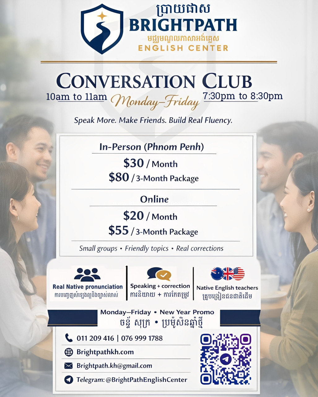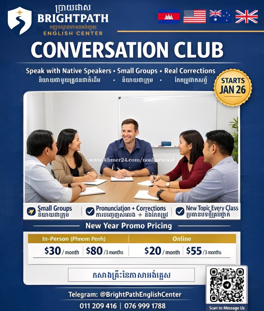 (ENGLISH BELOW) ចង់និយាយភាសាអង់គ្លេសកាន់តែមានទំនុកចិត្តមែនទេ? 😊📚🇺🇸🇦🇺🇬🇧 ក្លឹបសន្ទនារបស់យើងផ្តោតលើការនិយាយពិត ក្រុមតូចៗ ការកែតម្រូវច្បាស់លាស់ និងការអនុវត្តការបញ្ចេញសំឡេងជាមួយអ្នកនិយាយដើមកំណើតពិតប្រាកដ មិនមែនការបង្រៀនដែលគួរឱ្យធុញនោះទេ។ 📍 មជ្ឈមណ្ឌលភាសាអង់គ្លេស BrightPath ជិតផ្សារសុវណ្ណា ភ្នំពេញ 🗓 ចូលរៀនថ្ងៃទី 26 មករា 💰តម្លៃប្រូម៉ូសិនឆ្នាំថ្មី៖ រៀនផ្ទាល់: $30/ខែ | $80/3 ខែ អនឡាញ៖ $20/ខែ | 55 ដុល្លារ / 3 ខែ 💬 ផ្ញើសារនៅទីនេះនៅលើ Khmer24 ឬតេឡេក្រាម ប្រសិនបើអ្នកមានសំណួរ ឬចុះឈ្មោះ Want to speak English with more confidence? 😊📚🇺🇸🇦🇺🇬🇧 Our Conversation Club focuses on real speaking, small groups, clear corrections, and pronunciation practice with real native speakers, not boring lectures. 📍 BrightPath English Center, Sovanna, Phnom Penh 🗓 Classes start Jan 26 💰 New Year's promotion price: In-person: $30/month | $80/3 months Online: $20/month | $55/3 months 💬 Message here on Khmer 24 or Telegram if you have any questions or for enrollment