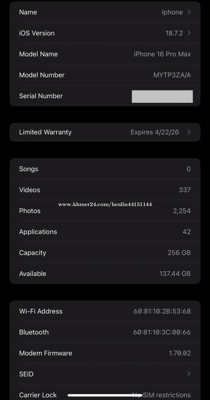 ត្រូវការលក់ទូរសព្ទ័16 ProMax ZA ប្រើផ្ទាល់ខ្លួន ព្រោះចង់ប្តូរសេរី ទូរសព័្ទនៅស្អាត 99%