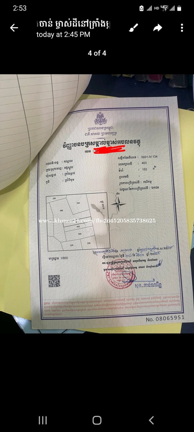 ដីនៅភូមិប្រាំបីមុំ ក្រាំងម្កាក់ ស្រុកអង្គស្នួល ខេត្តកណ្កាលដីជាប់ផ្លូវធំ30mល្អសំរាប់ប្រកបអាជីកម្មផ្សេងៗមានផ្ទះប្រជាពលរដ្ឋរស់នៅអូអរ នឹងមានរោងចក្រច្រើននៅក្បែរនោះ។