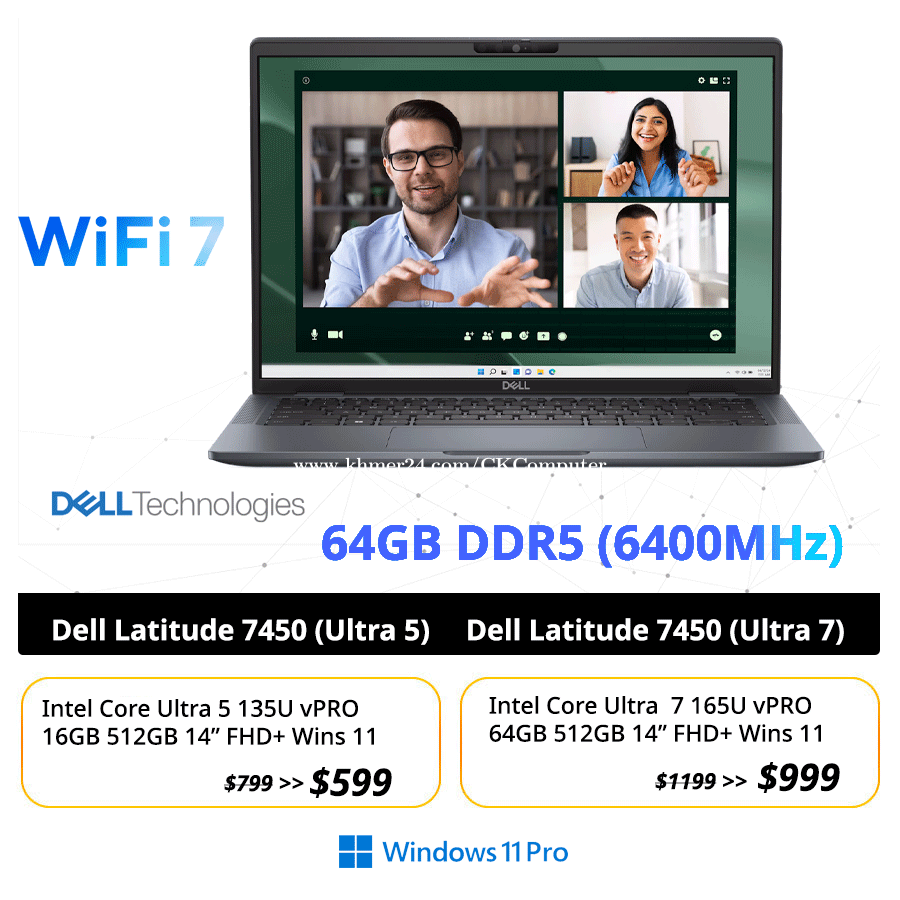 👉 Dell Latitude 14 7450 (wifi 7) ------------------------------------------- Intel Core Ultra 7 165U vPRO Processor RAM : 64GB LPDDR5x, 6400 MT/s 512 GB, M.2 2230, TLC PCIe Gen 4 NVMe 14", FHD+, IPS Aluminum, FHD IR Cam Intel BE200 Wi-Fi 7 2x2, Bluetooth 5.4 Technology, Wireless Card Windows 11 Pro | Battery 100% health 💛 VIP Price $1499 (new) >> $999 (used) ------------------------------------- ☎️ ទនាក់ទំនង 0950937xxxClick To Call 77 💬 Telegram : t.me/cnkcomputer93 🌐 Website: https://cnkcomputer.com/