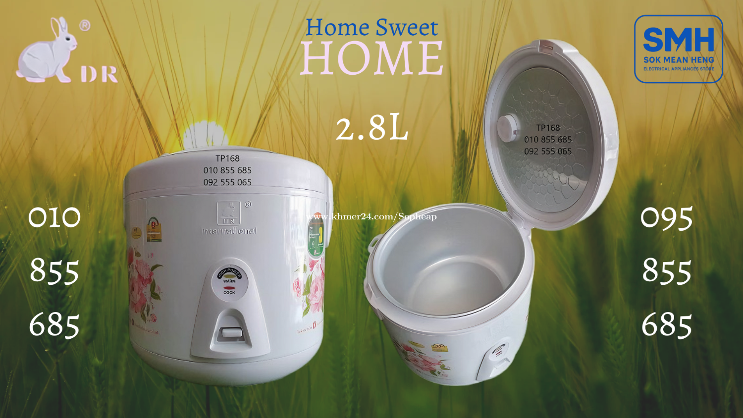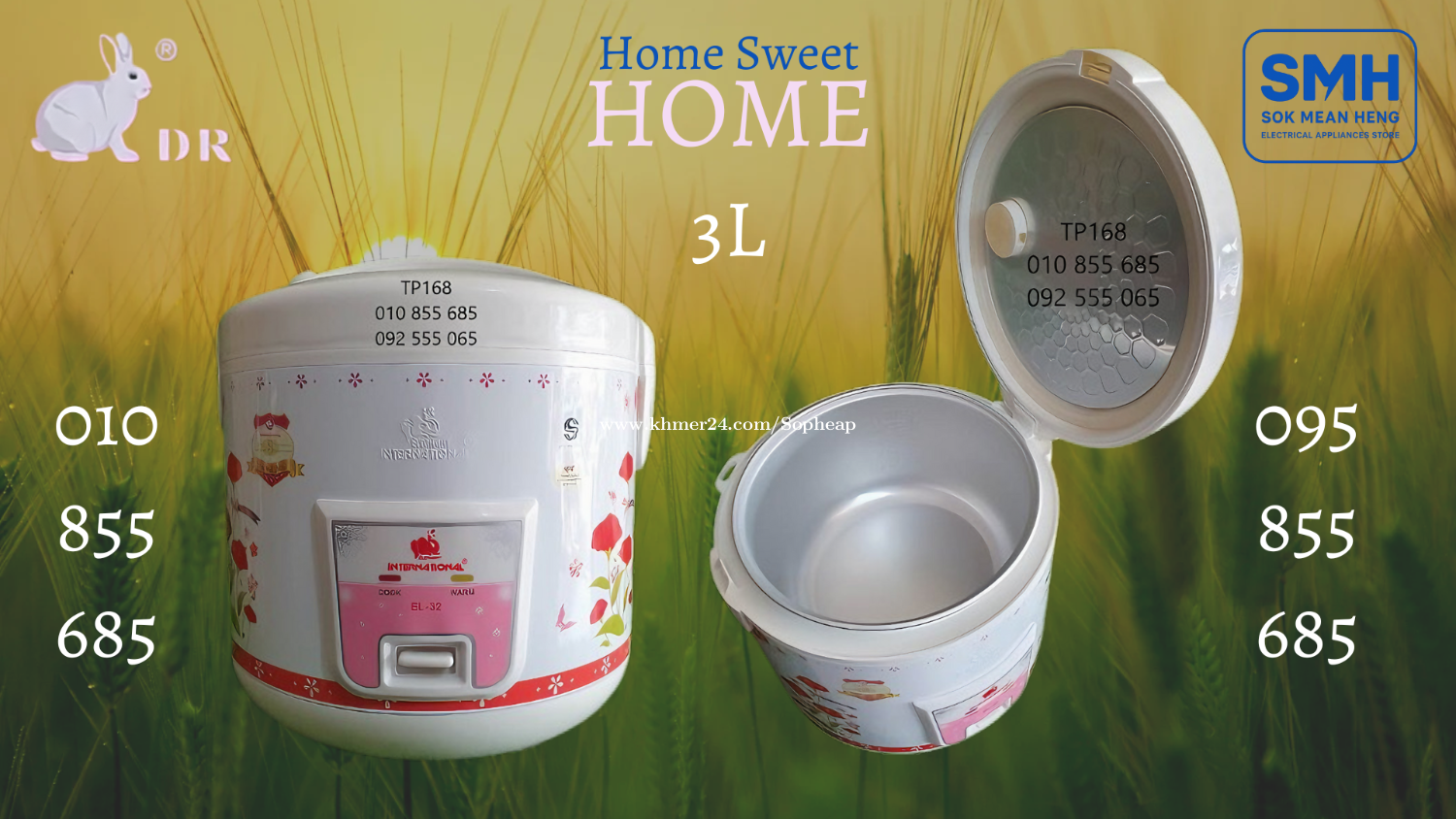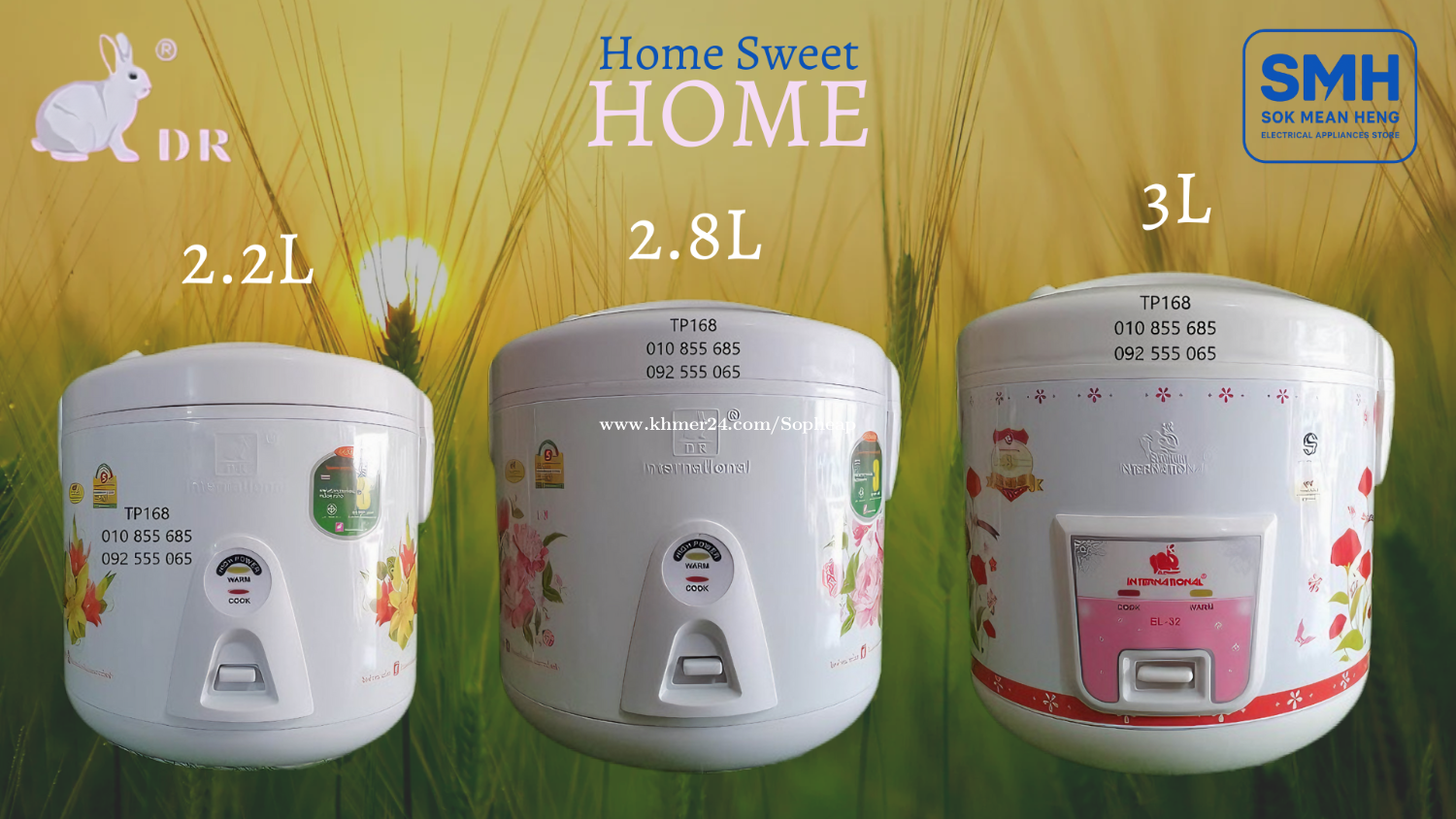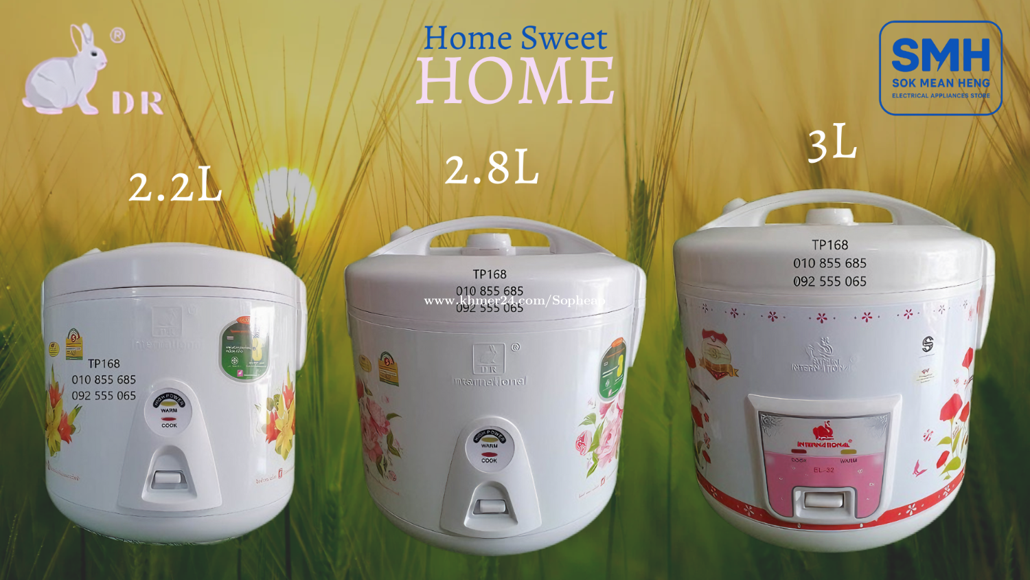 ឆ្នាំងដាំបាយអគ្គីសនី International DR Rice Cooker _ 2.2L / 2.8L / 3L (New) . - ផលិតផលប្រទេសថៃ / Made in Thailand - ដាំបាយ និងកំដៅដោយស្វ័យប្រវត្តិ - Automatic Cooking & Warming - គំរបជាប់ / Fixed Lid . 1. ឆ្នាំងដាំបាយអគ្គីសនី International DR-C22 Rice Cooker _ 2.2L - ចំណុះ / Capacity: 2.2លីត្រ / 2.2L - ចំនួនដាំ: 12 កំប៉ុងតូច = 6 កំប៉ុងទឹកដោះគោ - Vol: 1000W / 220V ~ 50Hz * តំលៃ / Price: 22.9$ . 2. ឆ្នាំងដាំបាយអគ្គីសនី International DR-C28 Rice Cooker _ 2.8L - ចំណុះ / Capacity: 2.8លីត្រ / 2.8L - ចំនួនដាំ: 15 កំប៉ុងតូច = 7.5 កំប៉ុងទឹកដោះគោ - Vol: 1200W / 220V ~ 50Hz * តំលៃ / Price: 28.9$ . 3. ឆ្នាំងដាំបាយអគ្គីសនី International EL-32 Rice Cooker _ 3L - ចំណុះ / Capacity: 3លីត្រ / 3L - ចំនួនដាំ: 18 កំប៉ុងតូច = 9 កំប៉ុងទឹកដោះគោ - Vol: 1200W / 220V ~ 50Hz * តំលៃ / Price: 32.9$ . SMH / សុខ មាន ហេង / Sok Mean Heng ហាងលក់គ្រឿងប្រើប្រាស់អគ្គិសនី / Electrical Appliances Store . ✅ ហាងផ្លូវការដែលមានការទទួលស្គាល់ត្រឹមត្រូវដោយ Khmer24 / Verified Business Account by Khmer24 💯 ទទួលបានទំនុកចិត្តខ្ពស់ពីអតិថិជនជាច្រើន / Trusted by Real Customers. 📍 មានទីតាំងច្បាស់លាស់ និងពិតប្រាកដនៅភ្នំពេញ / We have a clear and real/verified location in Phnom Penh. . Phone / Telegram (សេវាកម្មរហ័ស / Fast Service): Smart: 010855xxxClick To Call / https://t.me/Annsopheap Cellcard: 095855xxxClick To Call / http://t.me/Annsopheap095 . អាស័យដ្ឋាន / Address: No. 392, MaoTseToung Blvd. (St. 245), Phnom Penh. (Near P Jolie Beauty Center) . ផែនទី / Maps: https://www.google.com/maps?q=11.55595844757693,104.90165490657091&15 . #រូបទន្សាយ #ឆ្នាំងដាំបាយ #ឆ្នាំងដាំបាយអគ្គីសនី #ថៃ #គ្រឿងអគ្គីសនី #គ្រឿងប្រើប្រាស់អគ្គិសនី #InternationalDR #RiceCooker #ElectricRiceCooker #DRC22 #DRC28 #EL32 #Thailand #SMH #Appliances #ElectricAppliances #ElectricalAppliances #ApplianceStore #Promotion #Discount #Save #Free #New