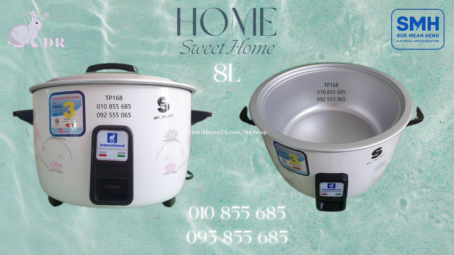 ឆ្នាំងដាំបាយអគ្គីសនី International DR Rice Cooker _ 6L / 8L (New) . - ផលិតផលប្រទេសថៃ / Made in Thailand - ដាំបាយ និងកំដៅដោយស្វ័យប្រវត្តិ - Automatic Cooking & Warming - គំរបដាច់ / Removable Lid . 1. ឆ្នាំងដាំបាយអគ្គីសនី International KDR-860 Rice Cooker _ 6L - ចំណុះ / Capacity: 6លីត្រ / 6L - ចំនួនដាំ: 28 កំប៉ុងតូច = 14 កំប៉ុងទឹកដោះគោ - Vol: 1,900W / 220V ~ 50Hz * តំលៃ / Price: 59.9$ . 2. ឆ្នាំងដាំបាយអគ្គីសនី International KDR-880 Rice Cooker _ 8L - ចំណុះ / Capacity: 8លីត្រ / 8L - ចំនួនដាំ: 31.5 កំប៉ុងតូច = 15.5 កំប៉ុងទឹកដោះគោ - Vol: 2,500W / 220V ~ 50Hz * តំលៃ / Price: 74.9$ . SMH / សុខ មាន ហេង / Sok Mean Heng ហាងលក់គ្រឿងប្រើប្រាស់អគ្គិសនី / Electrical Appliances Store . ✅ ហាងផ្លូវការដែលមានការទទួលស្គាល់ត្រឹមត្រូវដោយ Khmer24 / Verified Business Account by Khmer24 💯 ទទួលបានទំនុកចិត្តខ្ពស់ពីអតិថិជនជាច្រើន / Trusted by Real Customers. 📍 មានទីតាំងច្បាស់លាស់ និងពិតប្រាកដនៅភ្នំពេញ / We have a clear and real/verified location in Phnom Penh. . Phone / Telegram (សេវាកម្មរហ័ស / Fast Service): Smart: 010855xxxClick To Call / https://t.me/Annsopheap Cellcard: 095855xxxClick To Call / http://t.me/Annsopheap095 . អាស័យដ្ឋាន / Address: No. 392, MaoTseToung Blvd. (St. 245), Phnom Penh. (Near P Jolie Beauty Center) . ផែនទី / Maps: https://www.google.com/maps?q=11.55595844757693,104.90165490657091&15 . #រូបទន្សាយ #ឆ្នាំងដាំបាយ #ឆ្នាំងដាំបាយអគ្គីសនី #ថៃ #គ្រឿងអគ្គីសនី #គ្រឿងប្រើប្រាស់អគ្គិសនី #InternationalDR #RiceCooker #ElectricRiceCooker #KDR-860 #KDR-880 #Thailand #SMH #Appliances #ElectricAppliances #ElectricalAppliances #ApplianceStore #Promotion #Discount #Save #Free #New