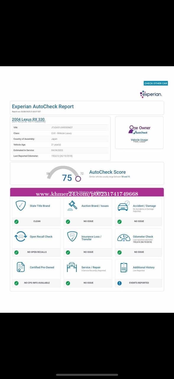 ទេីបតែមកដល់ក្តៅៗមិញៗមួយគ្រឿងទៀតហេីយថ្មីខ្លាំងណាស់🥇Lexus RX 330 ឆ្នាំ 2004 ប៉ុង1 ហ្វូលពេញ ក្នុងលឿងឡានការលី🥇ធានាឡានស្អាតថ្មីខ្លាំងអត់បុកអត់ច្រេសសាណុំស្រុីនមួយជុំ🥇ទិញដាច់វ៉ៃដូរបង់រំលស់គ្រប់ខេត្តក្រុង 💵តំលៃចរចារបានបងប្អូន ☎️069300xxxClick To Call/078300xxxClick To Call📲 🏡 https://www.facebook.com/share/p/1793PQEvq2/🙏😘