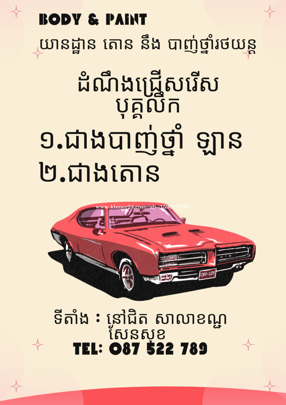 ដំណឹងជ្រេីសរេីសបុគ្គលឹក ១. ជាង បាញ់ថ្នាំ ឡាន ចំនួន ២នាក់ ទីតាំង .នៅសែនសុខ ទាក់ទង: 087522xxxClick To Call ឬ ឆាយ តាមTekegramb