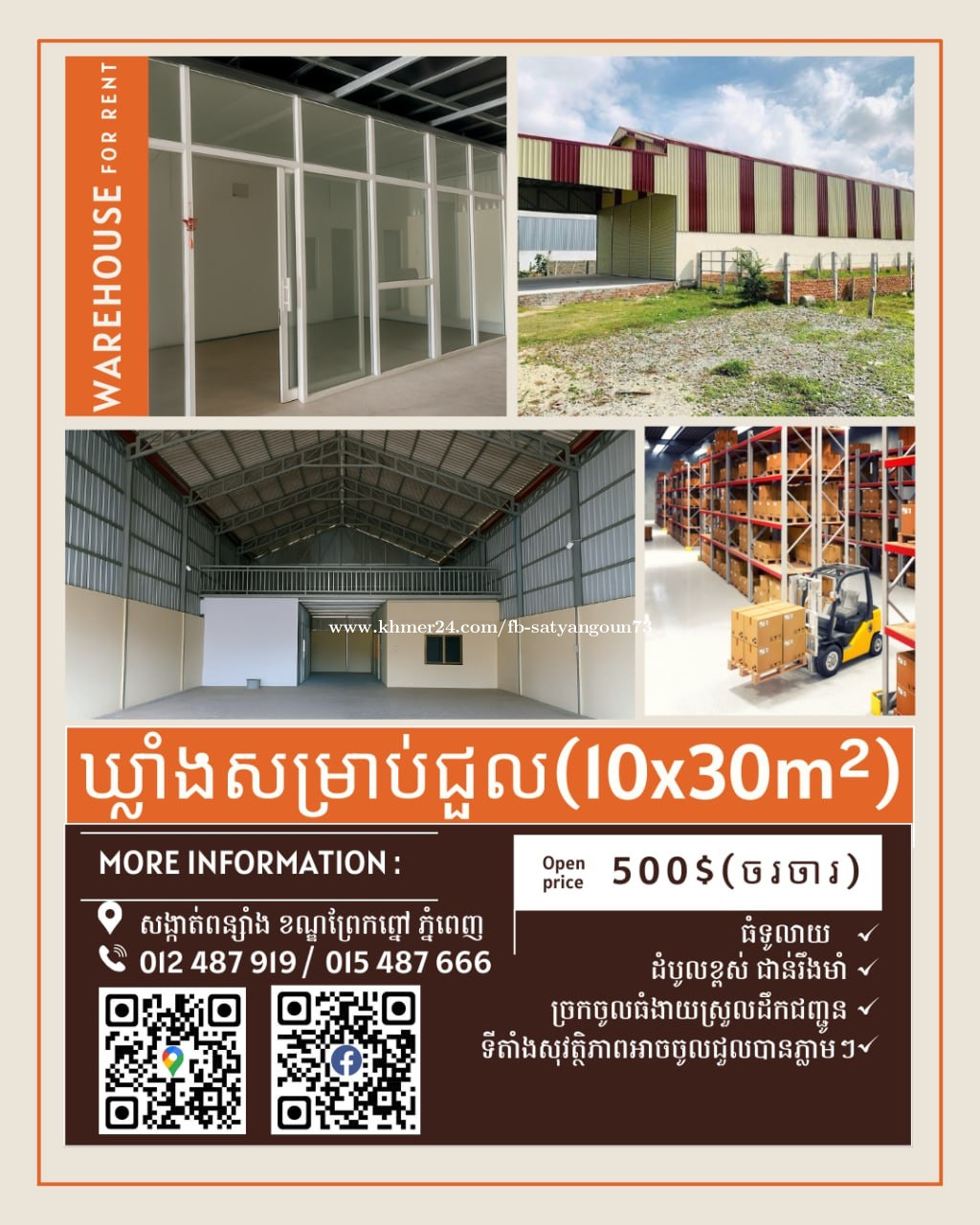 ឃ្លាំងជាប់ផ្លូវធំ កម្ពស់ស្តង់ដារឡានធំចូលបាន