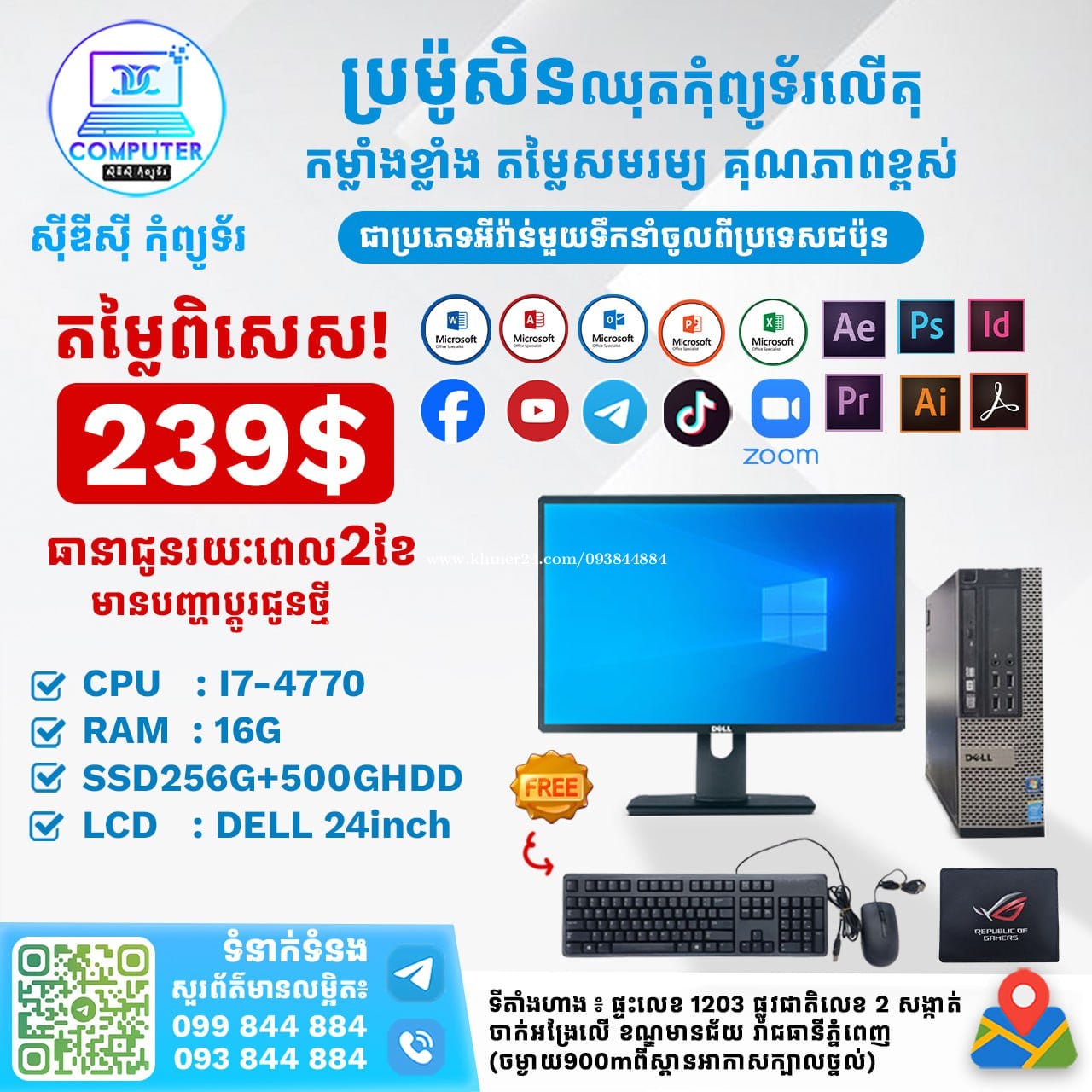 ឈុតកុំព្យូទ័រ DELL លើតុ ១ឈុតតម្លៃត្រឹមតែ 239$ CPU I7-4770 RAM 16G SSD 256G + Hdd 500G LCD DELL 24inch ថែមជូន Mouse Keybaord and Mouse Pad ធានារយះពេល 2ខែ អតិថិជនអាចអញ្ញើញមកមើលផ្ទាល់ដល់ទីតាំងហាងបានទំនិញមានស្រាប់មិនបាច់រង់ចាំយូរ! ☎️ទូរស័ព្ទលេខ : Smart093844xxxClick To Call / Cellcard099844xxxClick To Call 📬Telegram : t.me/CDCCOMPUTER093 🏠ទីតាំងហាង : ផ្ទះលេខ 1203 ផ្លូវជាតិលេខ2 , ចាក់អង្រែលើ , ខ័ណ្ឌមានជ័យ , ភ្នំពេញ ( ចំងាយ 900m ពីស្ពានអាកាសក្បាលថ្នល់ ) 📍 Google map : https://maps.app.goo.gl/R3W9thPP5omgsMaZA