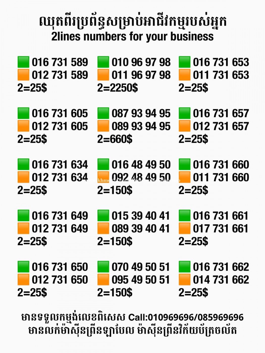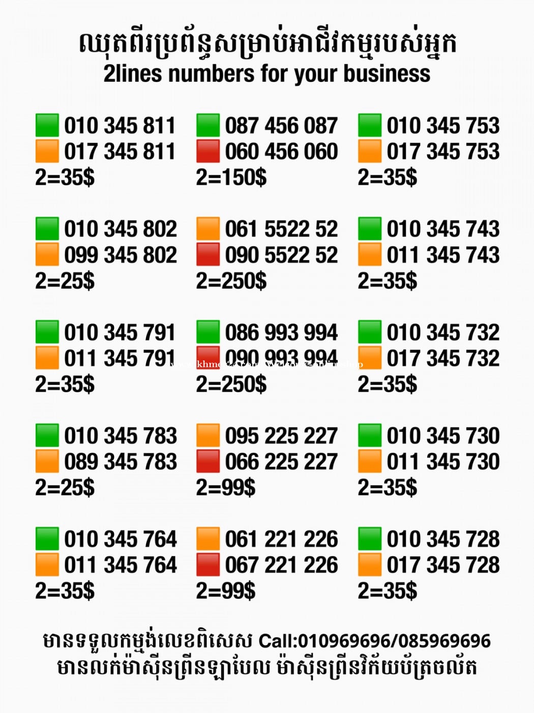 មានលក់លេខពិសេស មានទទួលកម្មង់លេខពិសេស មានលក់ម៉ាស៊ីនព្រីនឡាបែល មានលក់ម៉ាស៊ីនព្រីនវិក័យប័ត្រ មានលក់សម្ភារៈប្រើប្រាស់ក្នុងគ្រួសារ Smart Prime II 1=30$ Smart hero 1=40$ ទូរសព្ទថ្មីក្នុងប្រអប់ លក់ធូរៗរហូតអស់ពីស្តុក អាចប្រើជាឧបករណ៍សម្រាប់ស៊ែរ wifi បាន ទំនាក់ទំនង(ខ្មែរ | English | 中文):010969696 | 085969696 Telegram: https://t.me/W9696 Telegram group: https://t.me/konkonnada អាសយដ្ឋាន:ផ្ទះលេខ២៣ ផ្លូវបេតុងលេខ១ ភូមិទួលពង្រ សង្កាត់ចោមចៅ ខណ្ឌពោធិ៍សែនជ័យ រាជធានីភ្នំពេញ ទីតាំង https://goo.gl/maps/8moqW4iTHUfJEvWQ9 ដើម្បីស្វែងរកលេខអាជីវកម្មដែលលោកអ្នកពេញចិត្ត សូមចូលទៅកាន់:https://www.khmer24.com/Welcome-onlineshop