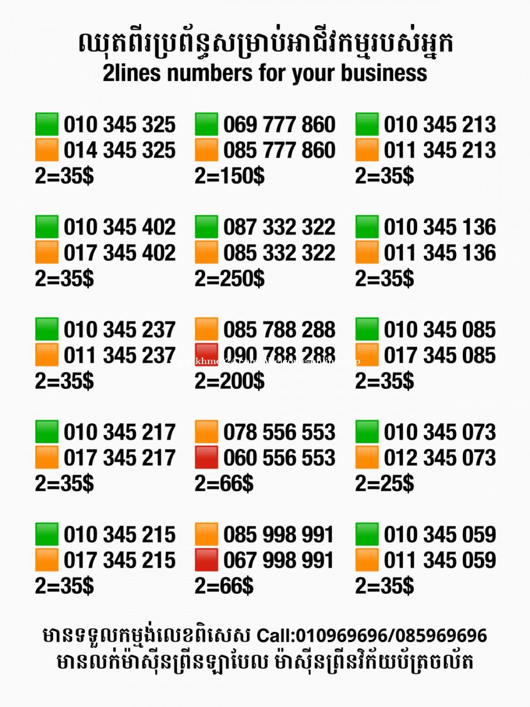 មានលក់លេខពិសេស មានទទួលកម្មង់លេខពិសេស មានលក់ម៉ាស៊ីនព្រីនឡាបែល មានលក់ម៉ាស៊ីនព្រីនវិក័យប័ត្រ មានលក់សម្ភារៈប្រើប្រាស់ក្នុងគ្រួសារ Smart Prime II 1=30$ Smart hero 1=40$ ទូរសព្ទថ្មីក្នុងប្រអប់ លក់ធូរៗរហូតអស់ពីស្តុក អាចប្រើជាឧបករណ៍សម្រាប់ស៊ែរ wifi បាន ទំនាក់ទំនង(ខ្មែរ | English | 中文):010969696 | 085969696 Telegram: https://t.me/W9696 Telegram group: https://t.me/konkonnada អាសយដ្ឋាន:ផ្ទះលេខ២៣ ផ្លូវបេតុងលេខ១ ភូមិទួលពង្រ សង្កាត់ចោមចៅ ខណ្ឌពោធិ៍សែនជ័យ រាជធានីភ្នំពេញ ទីតាំង https://goo.gl/maps/8moqW4iTHUfJEvWQ9 ដើម្បីស្វែងរកលេខអាជីវកម្មដែលលោកអ្នកពេញចិត្ត សូមចូលទៅកាន់:https://www.khmer24.com/Welcome-onlineshop