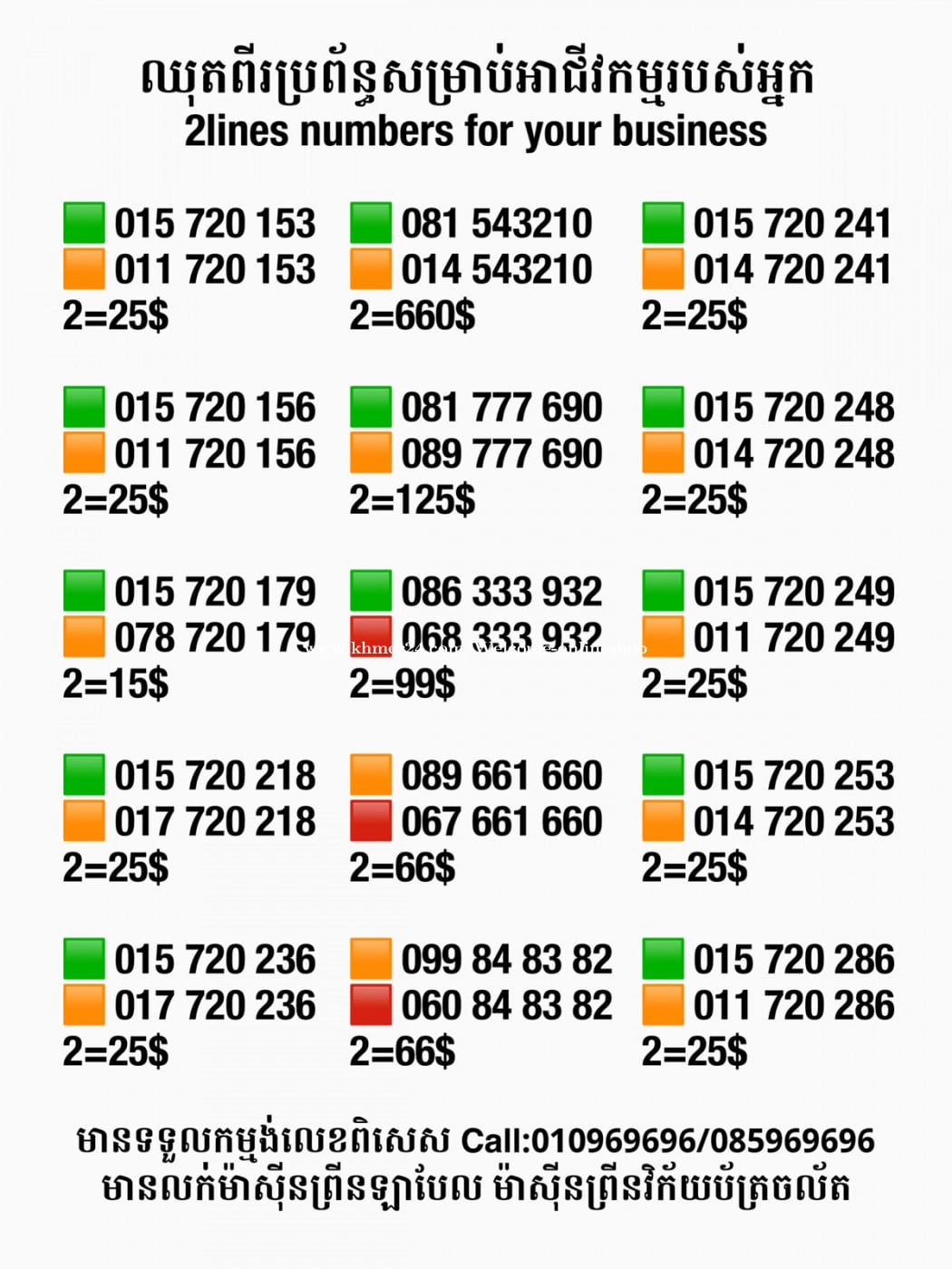 មានលក់លេខពិសេស មានទទួលកម្មង់លេខពិសេស មានលក់ម៉ាស៊ីនព្រីនឡាបែល មានលក់ម៉ាស៊ីនព្រីនវិក័យប័ត្រ មានលក់សម្ភារៈប្រើប្រាស់ក្នុងគ្រួសារ Smart Prime II 1=30$ Smart hero 1=40$ ទូរសព្ទថ្មីក្នុងប្រអប់ លក់ធូរៗរហូតអស់ពីស្តុក អាចប្រើជាឧបករណ៍សម្រាប់ស៊ែរ wifi បាន ទំនាក់ទំនង(ខ្មែរ | English | 中文):010969696 | 085969696 Telegram: https://t.me/W9696 Telegram group: https://t.me/konkonnada អាសយដ្ឋាន:ផ្ទះលេខ២៣ ផ្លូវបេតុងលេខ១ ភូមិទួលពង្រ សង្កាត់ចោមចៅ ខណ្ឌពោធិ៍សែនជ័យ រាជធានីភ្នំពេញ ទីតាំង https://goo.gl/maps/8moqW4iTHUfJEvWQ9 ដើម្បីស្វែងរកលេខអាជីវកម្មដែលលោកអ្នកពេញចិត្ត សូមចូលទៅកាន់:https://www.khmer24.com/Welcome-onlineshop