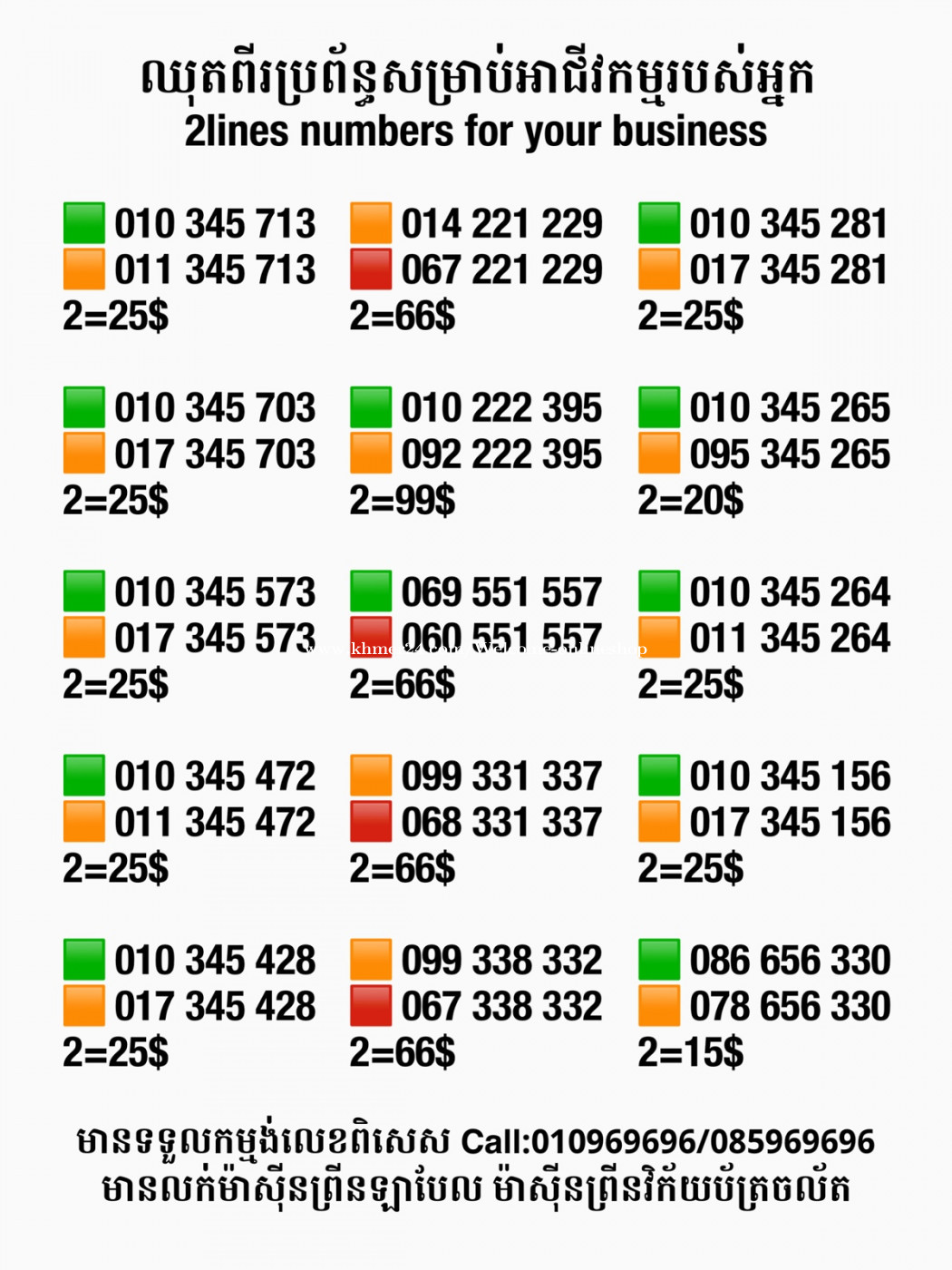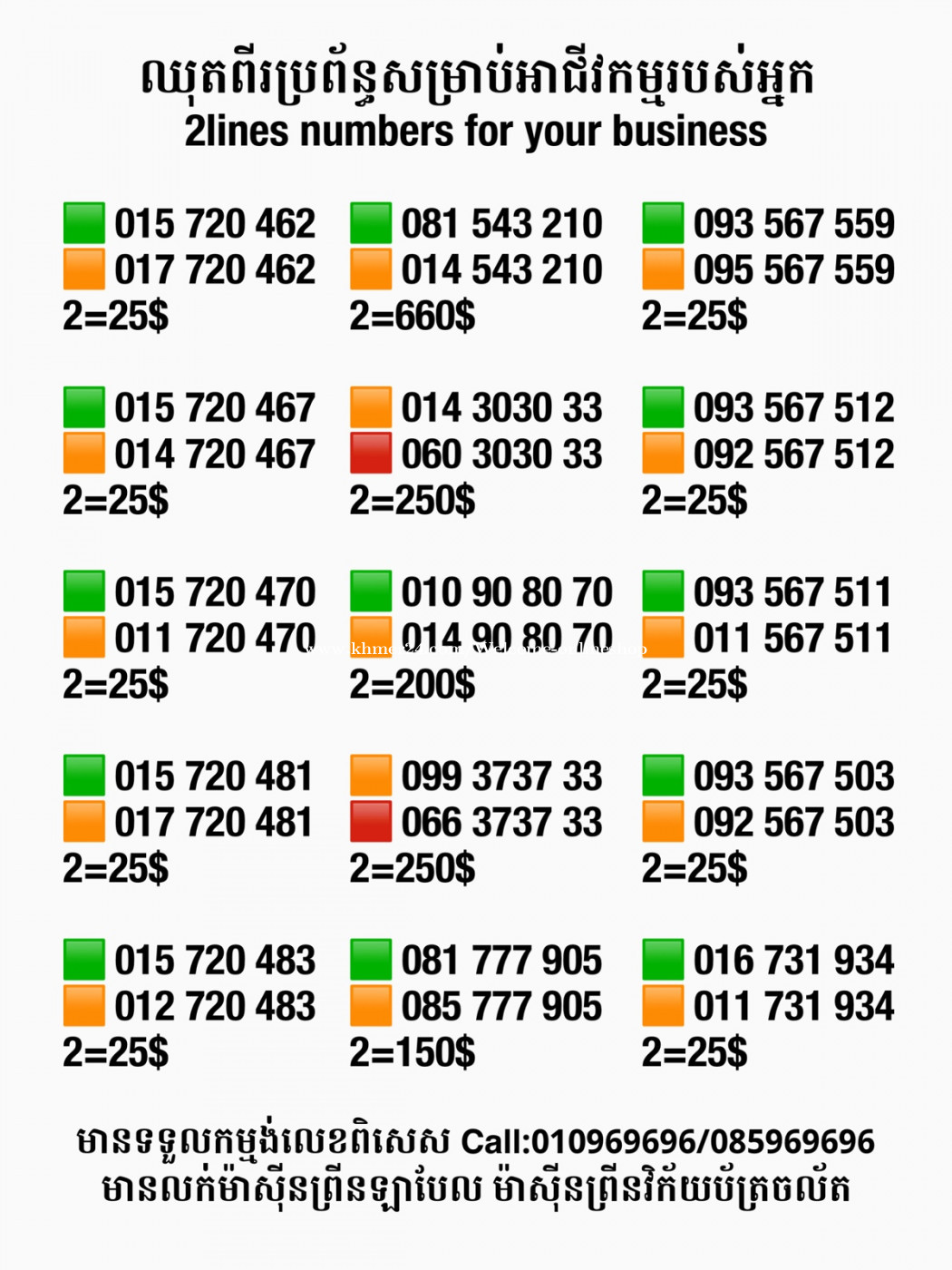 មានលក់លេខពិសេស មានទទួលកម្មង់លេខពិសេស មានលក់ម៉ាស៊ីនព្រីនឡាបែល មានលក់ម៉ាស៊ីនព្រីនវិក័យប័ត្រ មានលក់សម្ភារៈប្រើប្រាស់ក្នុងគ្រួសារ Smart Prime II 1=30$ Smart hero 1=40$ ទូរសព្ទថ្មីក្នុងប្រអប់ លក់ធូរៗរហូតអស់ពីស្តុក អាចប្រើជាឧបករណ៍សម្រាប់ស៊ែរ wifi បាន ទំនាក់ទំនង(ខ្មែរ | English | 中文):010969696 | 085969696 Telegram: https://t.me/W9696 Telegram group: https://t.me/konkonnada អាសយដ្ឋាន:ផ្ទះលេខ២៣ ផ្លូវបេតុងលេខ១ ភូមិទួលពង្រ សង្កាត់ចោមចៅ ខណ្ឌពោធិ៍សែនជ័យ រាជធានីភ្នំពេញ ទីតាំង https://goo.gl/maps/8moqW4iTHUfJEvWQ9 ដើម្បីស្វែងរកលេខអាជីវកម្មដែលលោកអ្នកពេញចិត្ត សូមចូលទៅកាន់:https://www.khmer24.com/Welcome-onlineshop