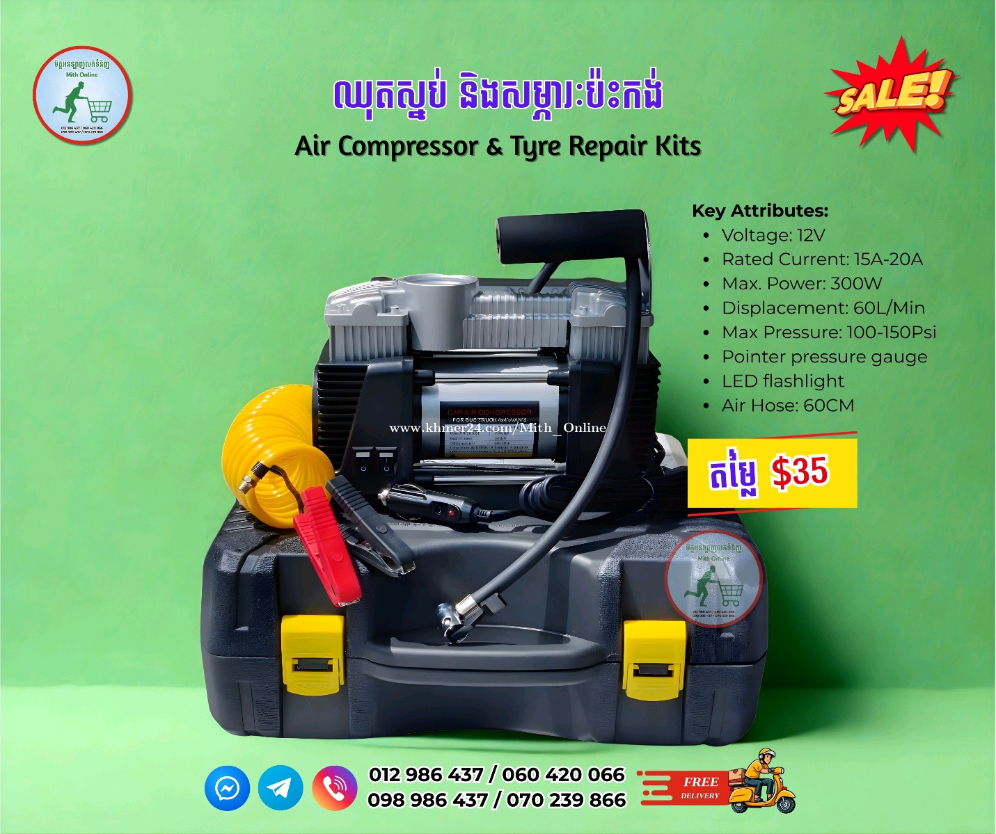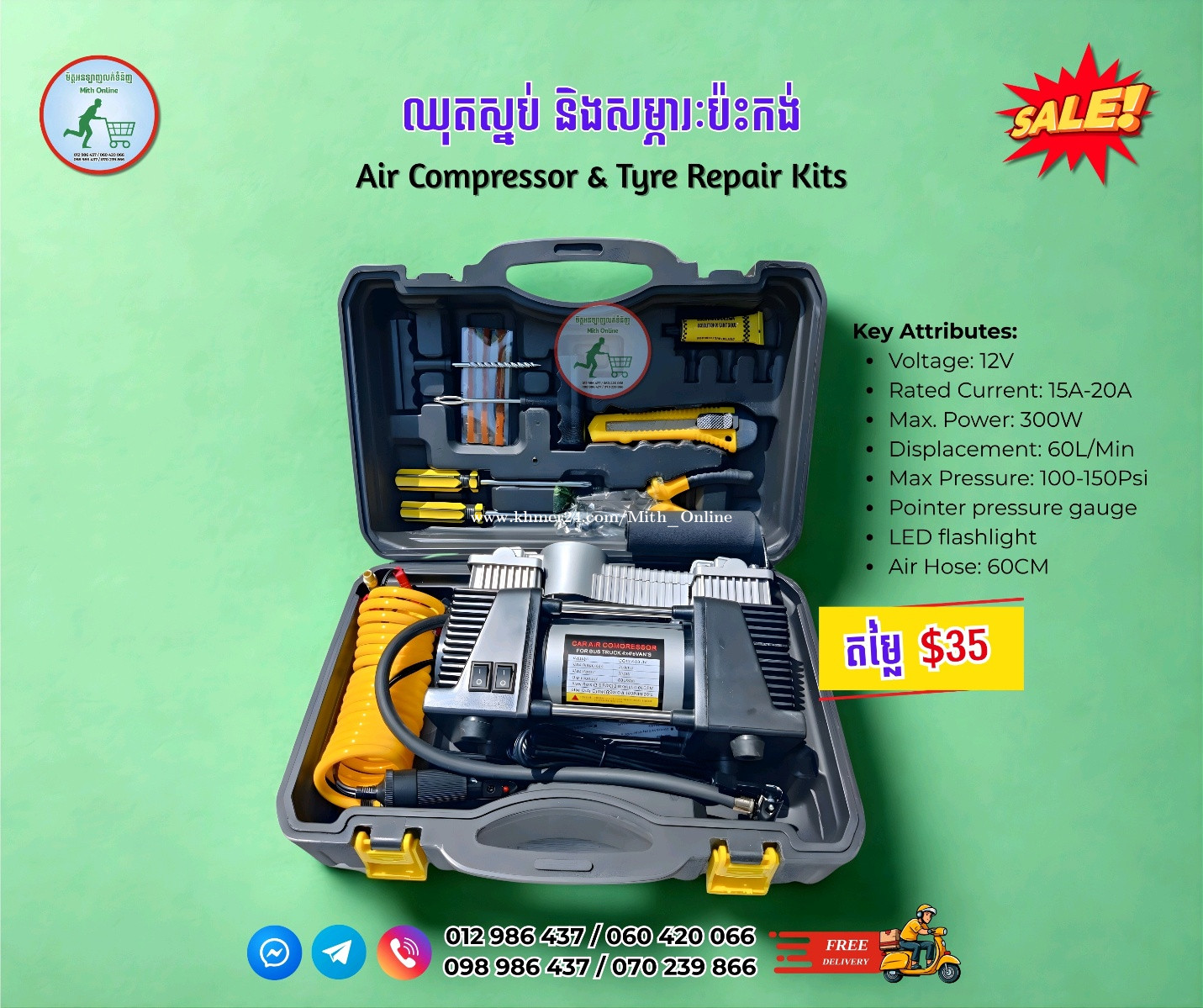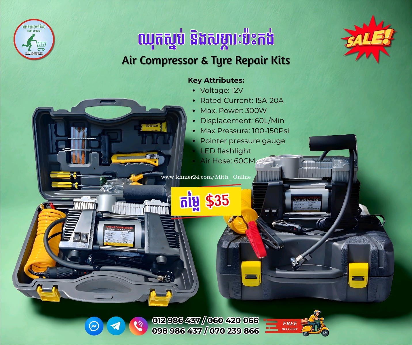 🔩 ឈុតស្នប់ និងសម្ភារៈប៉ះកង់ 🔩 Air Compressor & Tyre Repair Kits 💰 តម្លៃ $35 📦 ដឹកជញ្ជូនឥតគិតថ្លៃ Free Delivery ☎️ 012986xxxClick To Call / 060420xxxClick To Call ☎️ 098986xxxClick To Call