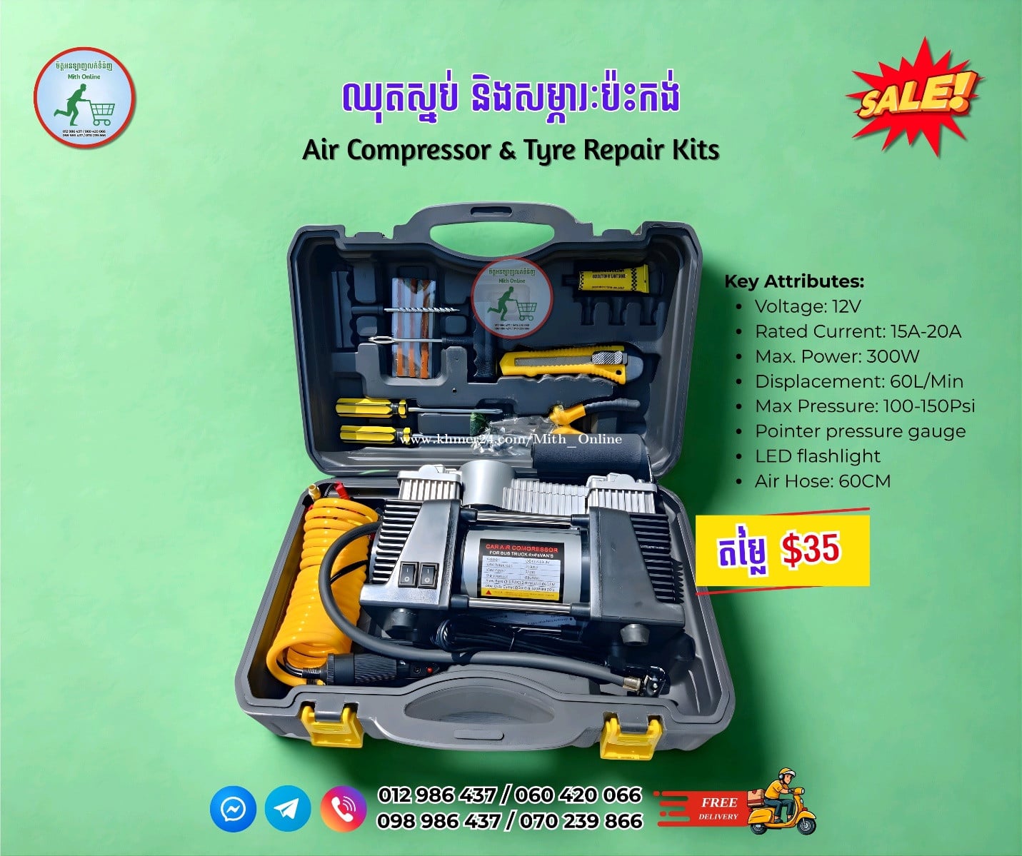 🔩 ឈុតស្នប់ និងសម្ភារៈប៉ះកង់ 🔩 Air Compressor & Tyre Repair Kits 💰 តម្លៃ $35 📦 ដឹកជញ្ជូនឥតគិតថ្លៃ Free Delivery ☎️ 012986xxxClick To Call / 060420xxxClick To Call ☎️ 098986xxxClick To Call / 070239xxxClick To Call