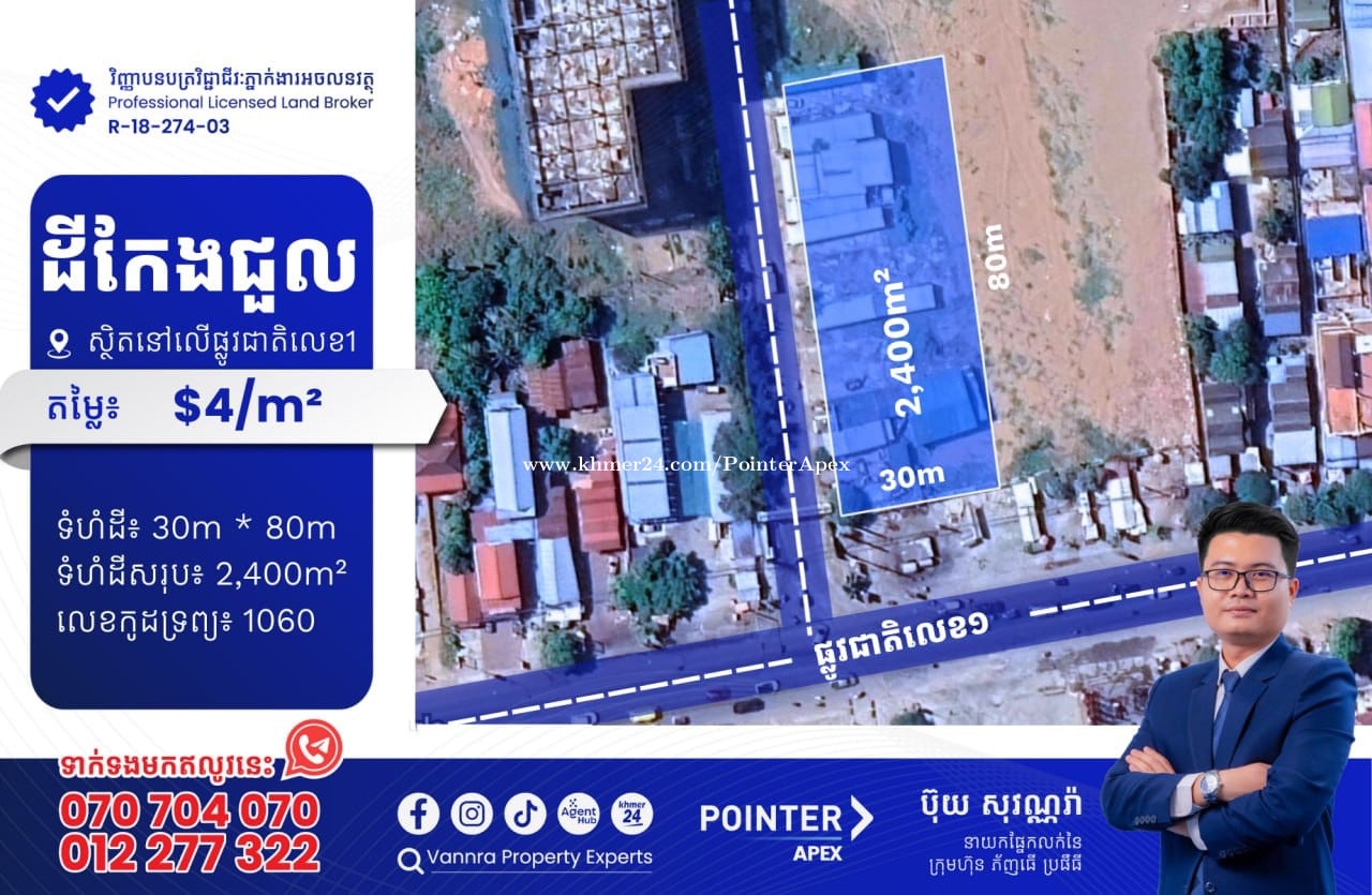 ដីកែងជួលនៅលើផ្លូវជាតិលេខ1 សម្រាប់ជួល: $4/m² ទំហំដី: 30m x 80m ទំហំដីសរុប: 2,400m² 🔐លេខកូដអចលនវត្ថុ៖ 1060 ស្ថិតនៅលើផ្លូវជាតិលេខ1 សង្កាត់វាលស្បូវ ខណ្ឌច្បារអំពៅ ភ្នំពេញ ——————————— ទាក់ទងមកឥលូវនេះ៖ Call: 070704xxxClick To Call / 012277xxxClick To Call Telegram: https://t.me/vannraaa 微信号: vannra-experts - Channel: https://t.me/vannrapropertyexperts - Tiktok: https://www.tiktok.com/@vannra_property_experts - Facebook: https://www.facebook.com/vannra.phnompenh.property/