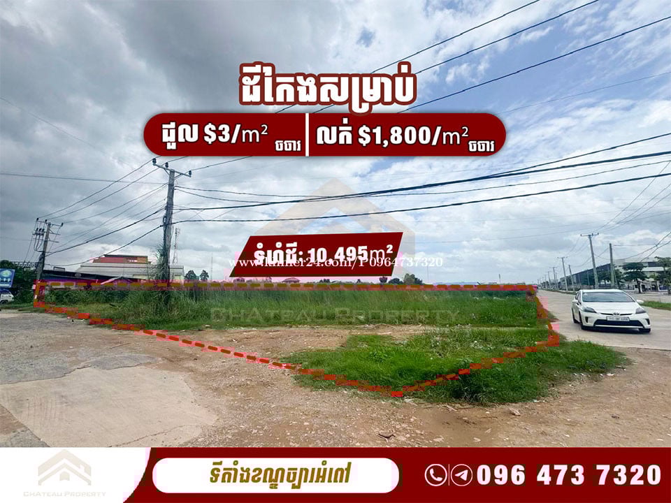 *តម្លៃជួល | Rental price: $3/m2 (ចរចា | Negotiable) *តម្លៃលក់ | Selling price: $1,800/m2 (ចរចា | Negotiable) *ទំហំដី | Land size: 10,495m2 *ទីតាំង | Location: ខណ្ឌច្បារអំពៅជិតបុរីប៉េងហ៊ួត ________________________ Property Code: (9319)