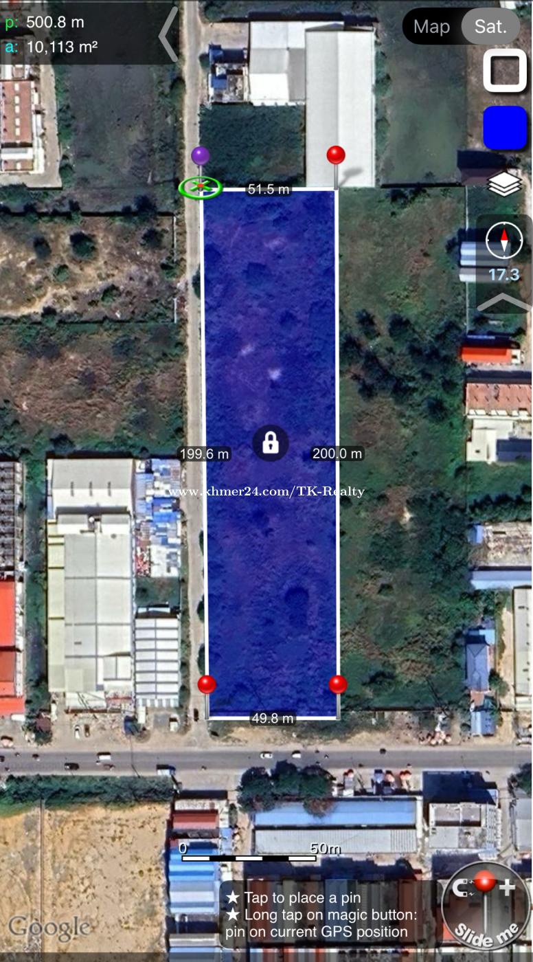 ដីកែងសំរាប់ជួលនៅលើផ្លូវ30m តម្លៃជួល: $1/m2 ទំហំដី :50m x 200m អាចសង់សាងឃ្លាំងអោយបាន ទីតាំងទល់មុខបុរីសន្តិភាព2