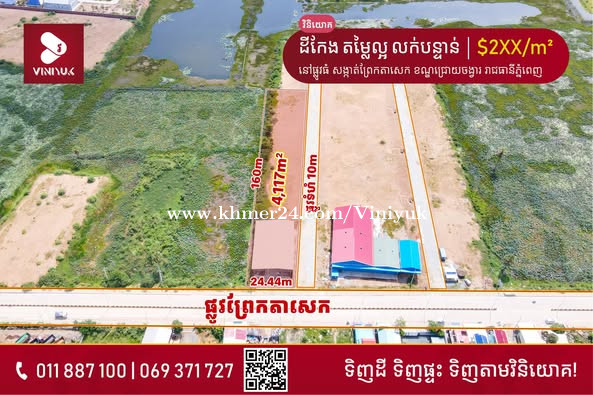 🏡ដីកែង តម្លៃល្អ លក់បន្ទាន់!! 📍ទីតាំង ៖ នៅផ្លូវធំ សង្កាត់ព្រែកតាសេក ខណ្ឌជ្រោយចង្វារ រាជធានីភ្នំពេញ - តម្លៃ : $2XX/m² ចរចា - ទំហំដី : 24.44m x 160m (ទំហំក្នុងប្លង់ 4,117ម៉ែត្រការ៉េ ) - ប្លង់រឹង - លេខអាជ្ញាប័ណ្ណ : E-22-404