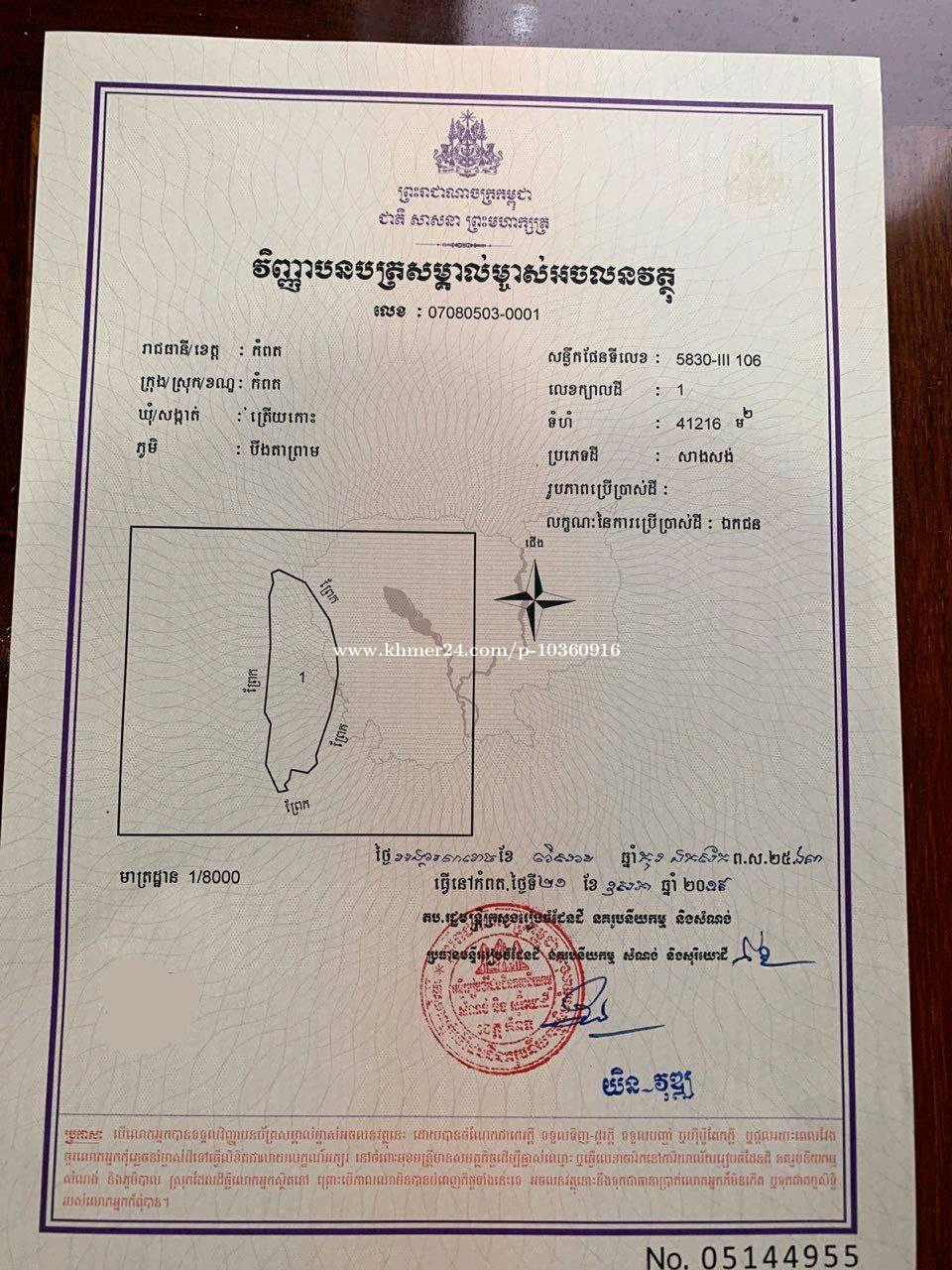 ជម្រាបសួរបង! ខ្ញុំមានព័ត៌មានដីកោះមួយកន្លែងម្ចាស់ត្រូវការលក់ - ទំហំសរុប 41216ម៉ែត្រការ៉េ - ប្លង់រឹងLMAP ( ប្រភេទដីសាងសង់) - ម្ចាស់ដាក់លក់ក្នុងតម្លៃ 5,500,000$ (ប្រាំលានប្រាំសែនដុល្លារ) ចរចា លក្ខណៈសម្បត្តិរបស់ដី - ដីហ៊ុំព័ទ្ធដោយព្រែកជុំវិញ(ដីកោះ) - មានផ្ទូវចូលដល់ដី ឡានចេញចូលជៀសគ្នាបាន (ផ្លូវឯកជនរបស់ម្ចាស់ដីកោះផ្ទាល់) - សាកសមនឹងអភិវឌ្ឍន៍ជារីសតផ្កាយប្រាំ(ខ្នាតធំ) និងផ្សេងៗ... - ពិសេសនោះ មានស្ពានថ្មី១ និង ផ្លូវវាងក្រុង១ខ្សែកំពុងកសាងកាត់ដីកោះនេះតែម្តង.. សូមអរគុណច្រើនបង🙏 # ទំនាក់ទំនងអ្នកសម្របសម្រួលជួយចរចាអោយបានតម្លៃល្អ 010360xxxClick To Call ( Telegram ) ឬ 090360xxxClick To Call