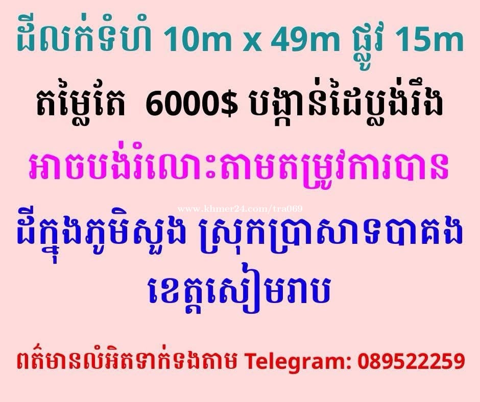 ដីក្នុងភូមិលក់មានបីទំហំ 10m x 49m = 6000$ 10m x 49m = 6000$ 18m x 49m = 9000$ ផ្លូវមុខដីទំហំ 15m ដីស្ថិតក្នុងភូមិសួង ស្រុកប្រាសាទបាគង ខេត្តសៀមរាប ដីចុះពីផ្លូវជាតិលេខ៦ តែ3km ប៉ុណ្ណោះ ពត៌មានលំអិតទំនាក់ទំនងតាមលេខ Telegram: 089522xxxClick To Call