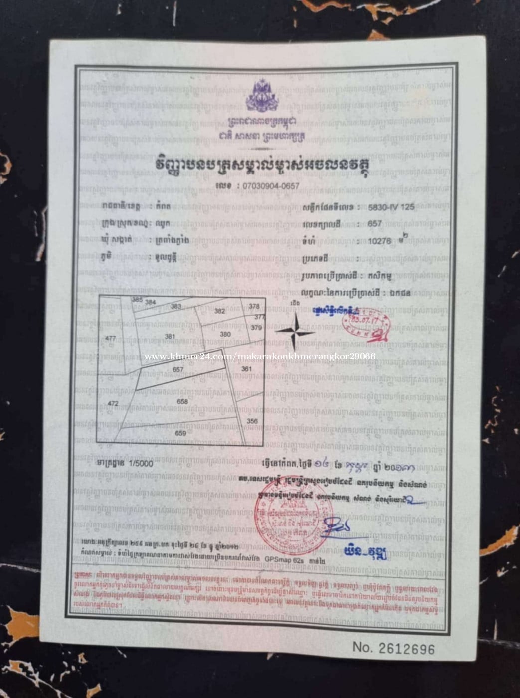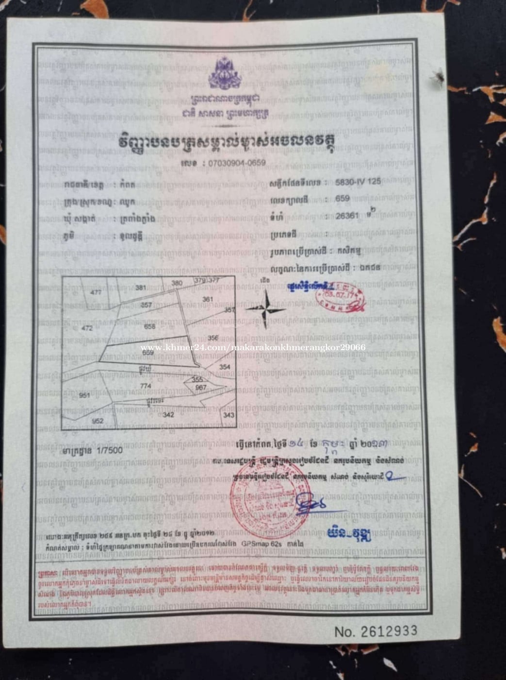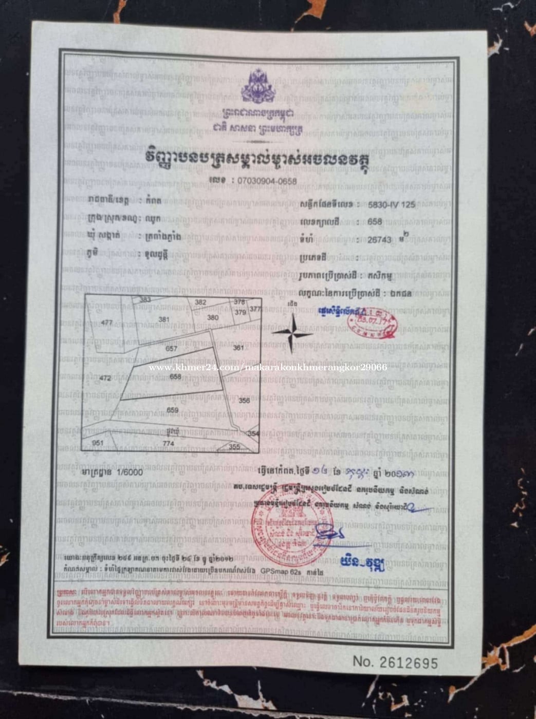 ដីចម្កាមានដំណាំទទួលផលស្រាប់លក់បន្ទាន់ធូៗនៅតាកែនកោះស្លា 👉ទំហំ74,500m2 👉ប្លង់រឹង(មាន3ប័ណ្ណ) 👉មានដំណាំហូបផ្លែដូចជា: 👉ដូង400ដើម 👉ស្វាយ1000ដើម 👉ស្វាយផ្អែម50ដើម 👉ធូរ៉េន100ដើម 👉មានស្រះទឹកសម្រាប់ដាក់ត្រីទំហំ20*40m 👉មានប្រព័ន្ធទឹកអណ្ដូង,ស្រះ,ភ្លើង 👉តម្លៃទីផ្សារក្នុងតំបន់5$/m2 👉តម្លៃលក់ត្រឹមតែ2.5$(ចរចា) 👉ផ្លូវរដ្ឋ14mឡានជិះចេញចូលស្រួល(ភ្លើង3ហ្វា) 📍ទីតាំងនៅភូមិដូន្តី ឃុំត្រពាំងភ្លាំង ស្រុកឈូក ខេត្តកំពត 0967761xxxClick To Call(Telegram) — in Kampot Province.