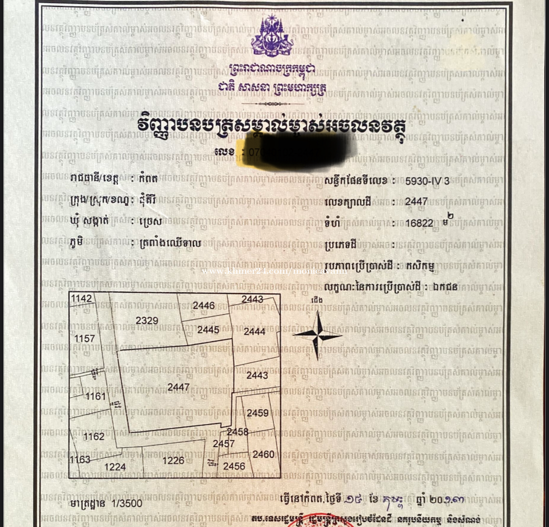 ដីប្លង់រឹង មានរាងប្រហែលនឹងការេ ព្រមទាំងមានដំណាំដាំដុះដូចជា៖ 1- ដូងប្រមាណជា 300ដើម កំពុងចាប់ផ្តើមប្រមូលផល 2- ដើមល្មើ 9ដើម នៅចាំតែងមេឃ 3- ស្វាយ 10ដើម 4- ក្រូចឆ្មា 80ដើម កំពុងចេញផ្កា និងផ្លែបាន 50ភាគរយ (ល្អខ្លាំងៗ) 5- ចេក 20ដើម ចេញផ្លែ 6- ស្រះទឹកចឹញ្ចឹមត្រីចំនួន 1 7- មាន់ 60ក្បាល 8- ល្ហុង មៀន ក្រូចឡុង ក្រូចពោធិ៍សាត់….ល…
