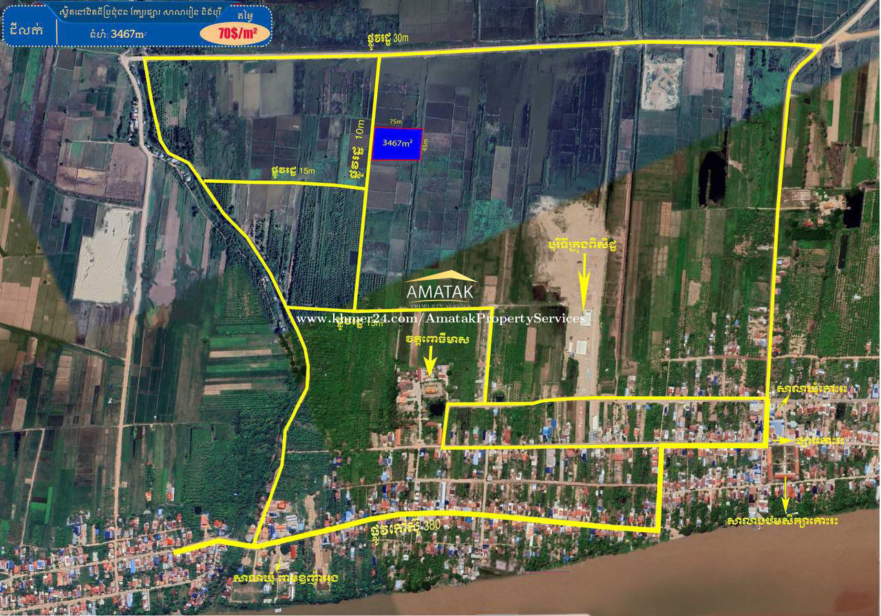 ដីចំការលក់ ក្បែរបុរីនិងគំរោងដីពុះឡូត៏ ឃុំពាមឧញ៉ាអុង ស្រុកល្វាឯម ខេត្តកណ្ដាល 👉. ទំហំ: 3467m2 👉. ប្លង់រឹង (ស្រប់ច្បាប់ ) 👉. ក្បាលដីជាប់ផ្លូវរដ្ឋ:10m 👍. ទីតាំងជាប់គំរោងបុរីប៉េងហួត និងបុរីពិសិដ្ឋ 👍. ក្បែរផ្សារ សាលារៀន គំរោងពុះដីឡូត៏ 👍. តម្លៃ: 70USD/m2 🌏. ទីតាំងដី: https://maps.app.goo.gl/vtQcCNtpf8Q98z3y5?g_st=it 📍. ទ្រង់ទ្រាយដី: https://fams.app/shared/1707317277655/PRm~gdl6Gov5hRgZPgy83 👉. សម្រាប់ពត័មានលម្អិត 017260xxxClick To Call , 016323xxxClick To Call 👉. តេលេក្រាមឆាត: https://t.me/chhintharo
