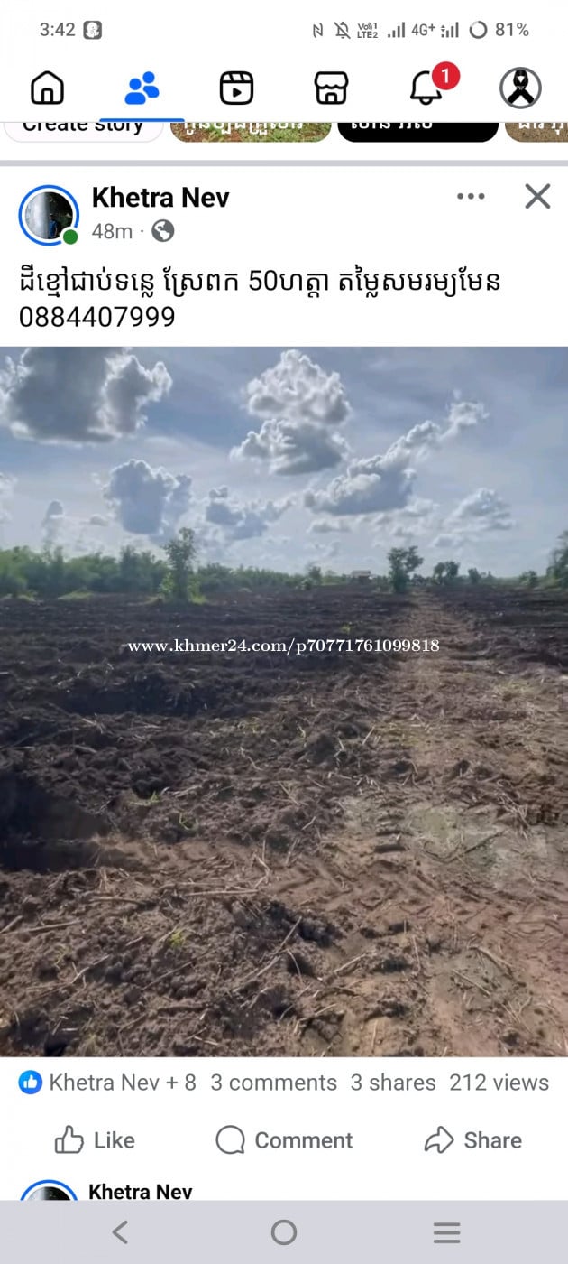 ដីចំការលក់ ទំហំ៥០ហិកតា ប្រភេទដីខ្មៅ ដីជាប់មាត់ទន្លេ ដីស្ថិតនៅភូមិស្រែកពកតូច ឃីជ័យឧត្តម ស្រុកកូនមុំ ខេត្តរតនគិរី