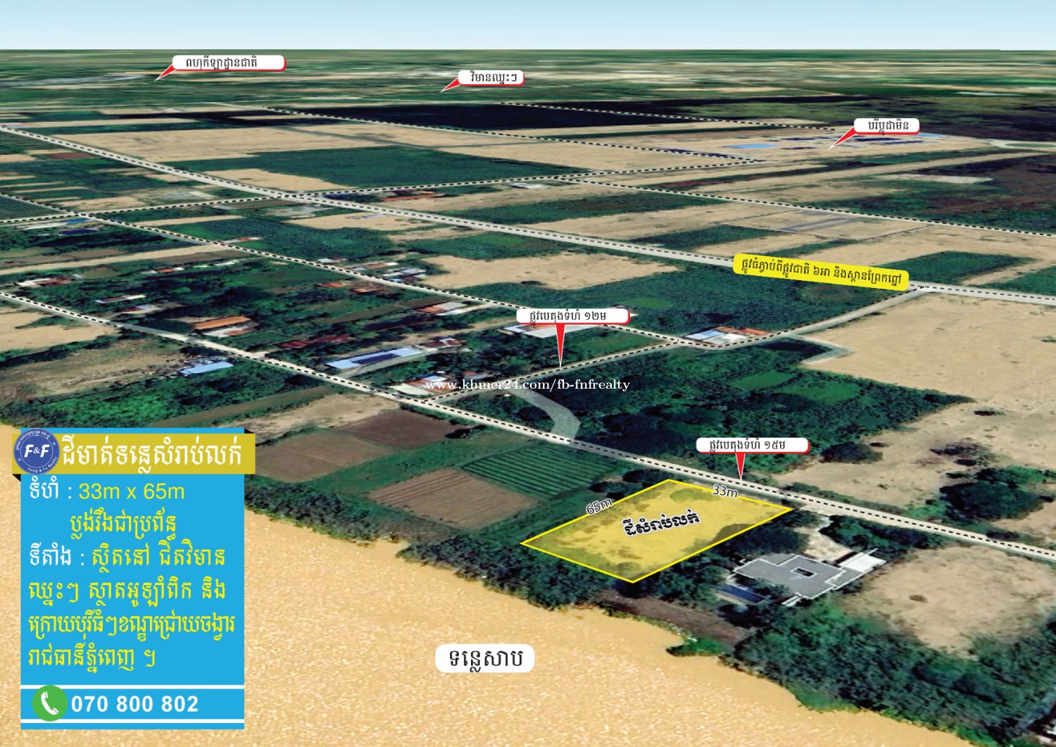 ដីជាប់មាត់ទន្លេលំហែសំរាប់លក់ ក្នុងរាជធានីភ្នំពេញ *ដីលក់ (ជាប់ទន្លេ) * - ក្បាលដី ជាប់ផ្លូវ 33m x ជំរៅទល់ទន្លេ 65m -ដីចាក់ ខ្សាច់បំពេញ រួចរាល់ ល្អសំរាប់សង់ផ្ទះលំហែ ជាប់ផ្លូវបេតុង - ប្លង់រឹង (L-map) - ជាតំបន់អភិវឌ្ឍន៍ខ្លាំង បុរីព័ទ្ធជំវិញ ជិតស្តាតអូឡាំពិកថី្ម សំរាប់ពត័មានបន្ថែម សូមទំនាក់ទំនងតាមលេខ 070800xxxClick To Call (telegram) https://t.me/fnf_realty ទីតាំង : សង្កាត់ព្រែកតាសេក ខ័ណ្ឌជ្រោយចង្វារ រាជធានីភ្នំពេញ ។ ឬអាច inbox , ទីតាំងផ្កាយរណប (Google Map) https://maps.app.goo.gl/cWCaj3uahUdF4U2T8