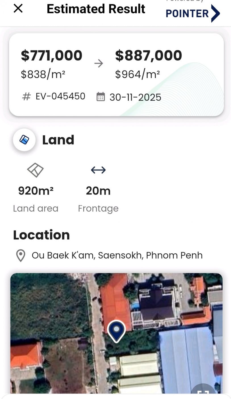 ដីលក់នៅជិត2004 ជិតសាលារៀន ផ្លូវបេតុង10m លក់តម្លៃ 75ម៉ឺន ចរចារ ការវាយតម្លៃដី តម្លៃចន្លោះ77ម៉ឺនដល់88ម៉ឺន ទំហំ 20*47 (920m2) 069888xxxClick To Call 012888xxxClick To Call