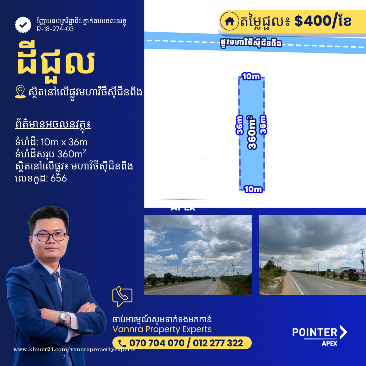 ដីសម្រាប់ជួលនៅលើផ្លូវមហាវិថី សុី ជីនពីង សម្រាប់ជួល:$400 ទំហំដី: 10m x 36m (360m2) 🔐លេខកូដអចលនវត្ថុ៖ 656 📌 លើផ្លូវមហាវិថី សុី ជីនពីងឃុំជើងកើប ស្រុកកណ្តាលស្ទឹង ខេត្តកណ្តាល ——————————— ទាក់ទងមកឥលូវនេះ៖ Call: 070704xxxClick To Call / 012277xxxClick To Call Telegram: https://t.me/vannraaa 微信号: vannra-experts - Channel: https://t.me/vannrapropertyexperts - Tiktok: https://www.tiktok.com/@vannra_property_experts - Facebook: https://www.facebook.com/vannra.phnompenh.property/