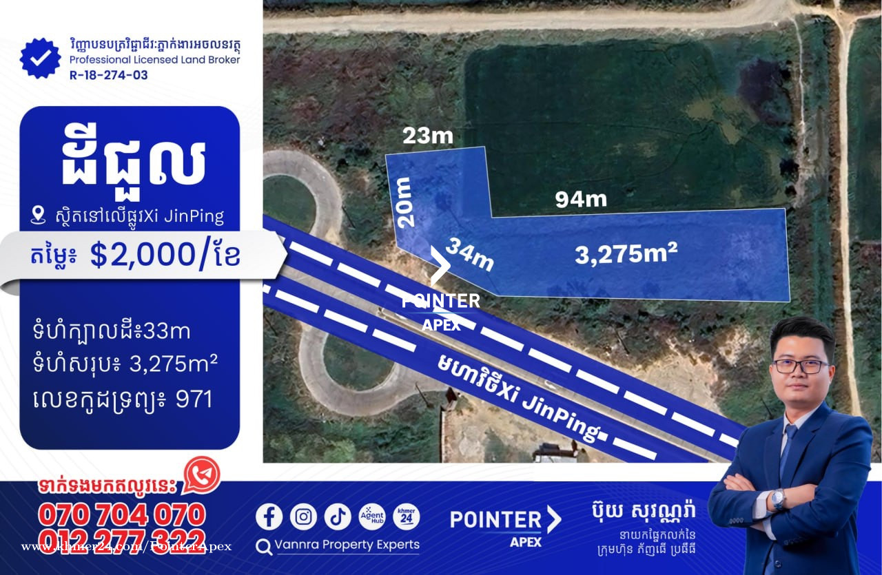 ដីជួលនៅលើផ្លូវមហាវិថី Xi JinPing សម្រាប់ជួល: $2,000/ខែ ទំហំក្បាលដី: 34m ទំហំដីសរុប: 3,275m² 🔐លេខកូដអចលនវត្ថុ៖ 971 ស្ថិតនៅលើផ្លូវមហាវិថី Xi JinPing ឃុំព្រះពុទ្ធ ស្រុកកណ្តាលស្ទឹង កណ្តាល ——————————— ទាក់ទងមកឥលូវនេះ៖ Call: 070704xxxClick To Call / 012277xxxClick To Call Telegram: https://t.me/vannraaa 微信号: vannra-experts - Channel: https://t.me/vannrapropertyexperts - Tiktok: https://www.tiktok.com/@vannra_property_experts - Facebook: https://www.facebook.com/vannra.phnompenh.property/